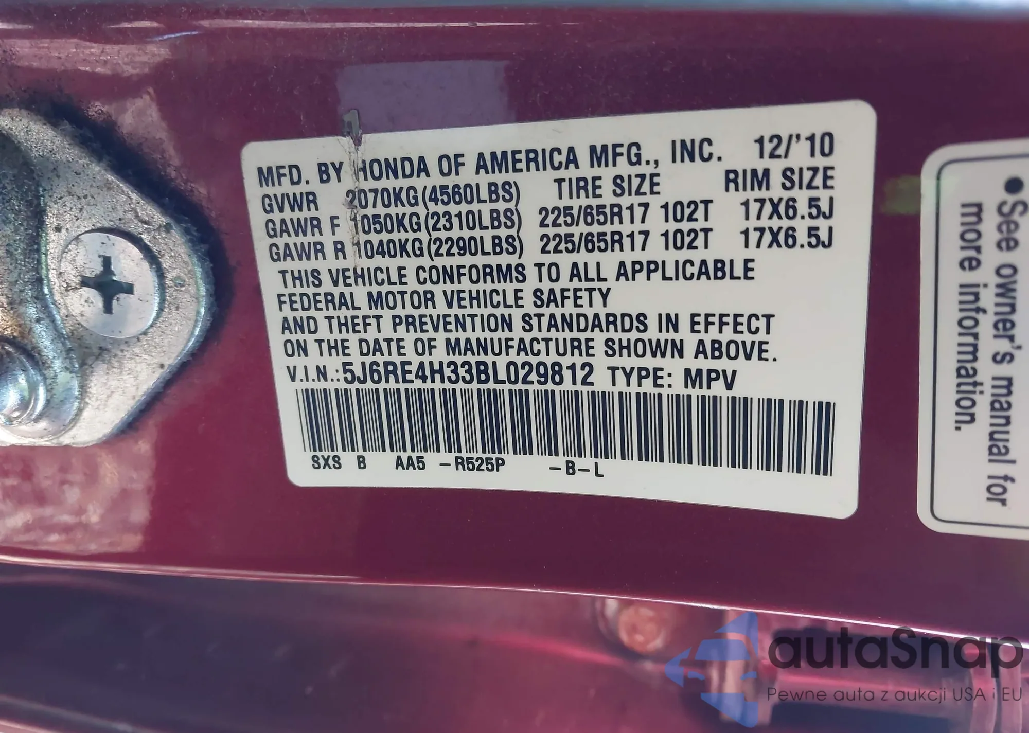• VIN 5J6RE4H33BL029812