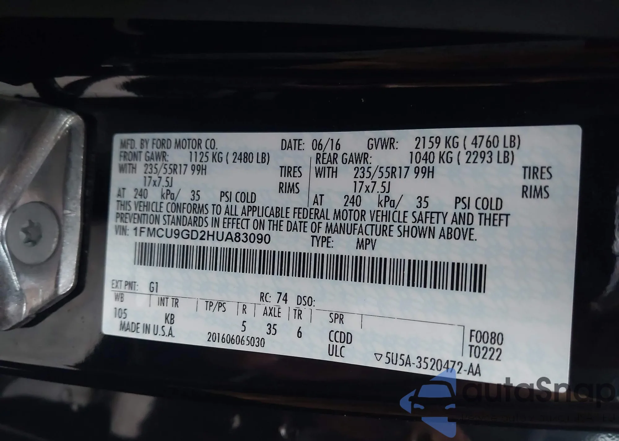 • VIN 1FMCU9GD2HUA83090