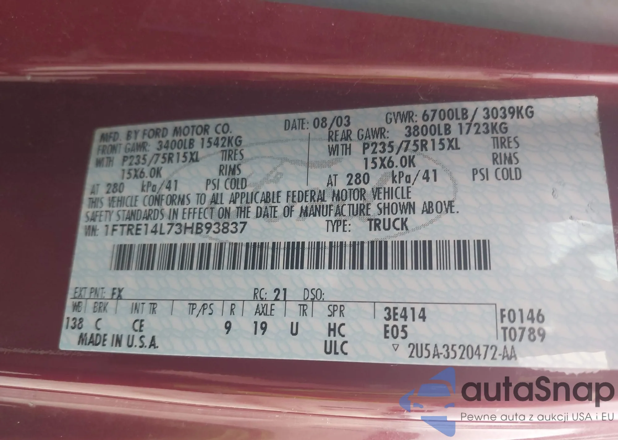 • VIN 1FTRE14L73HB93837