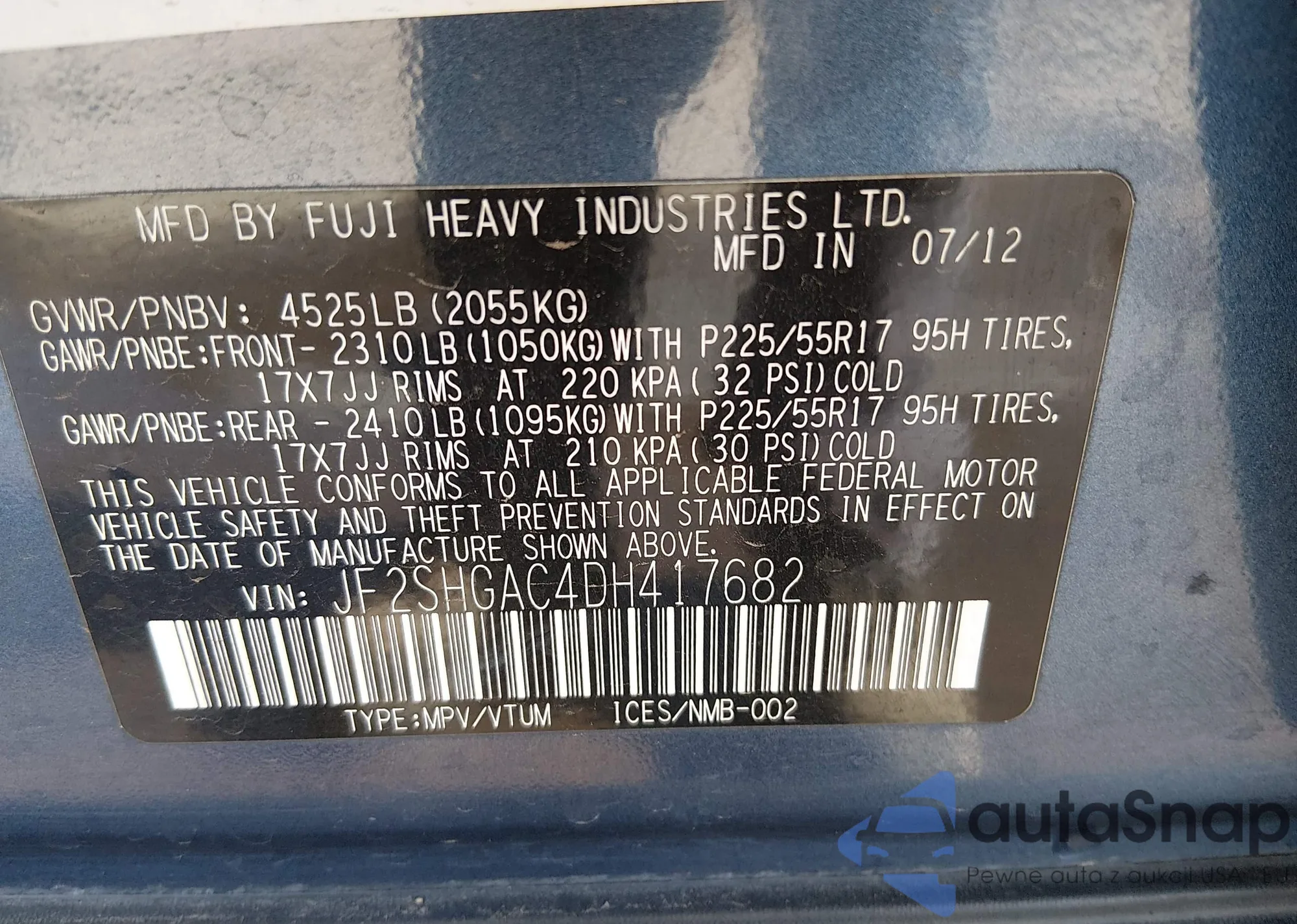 • VIN JF2SHGAC4DH417682