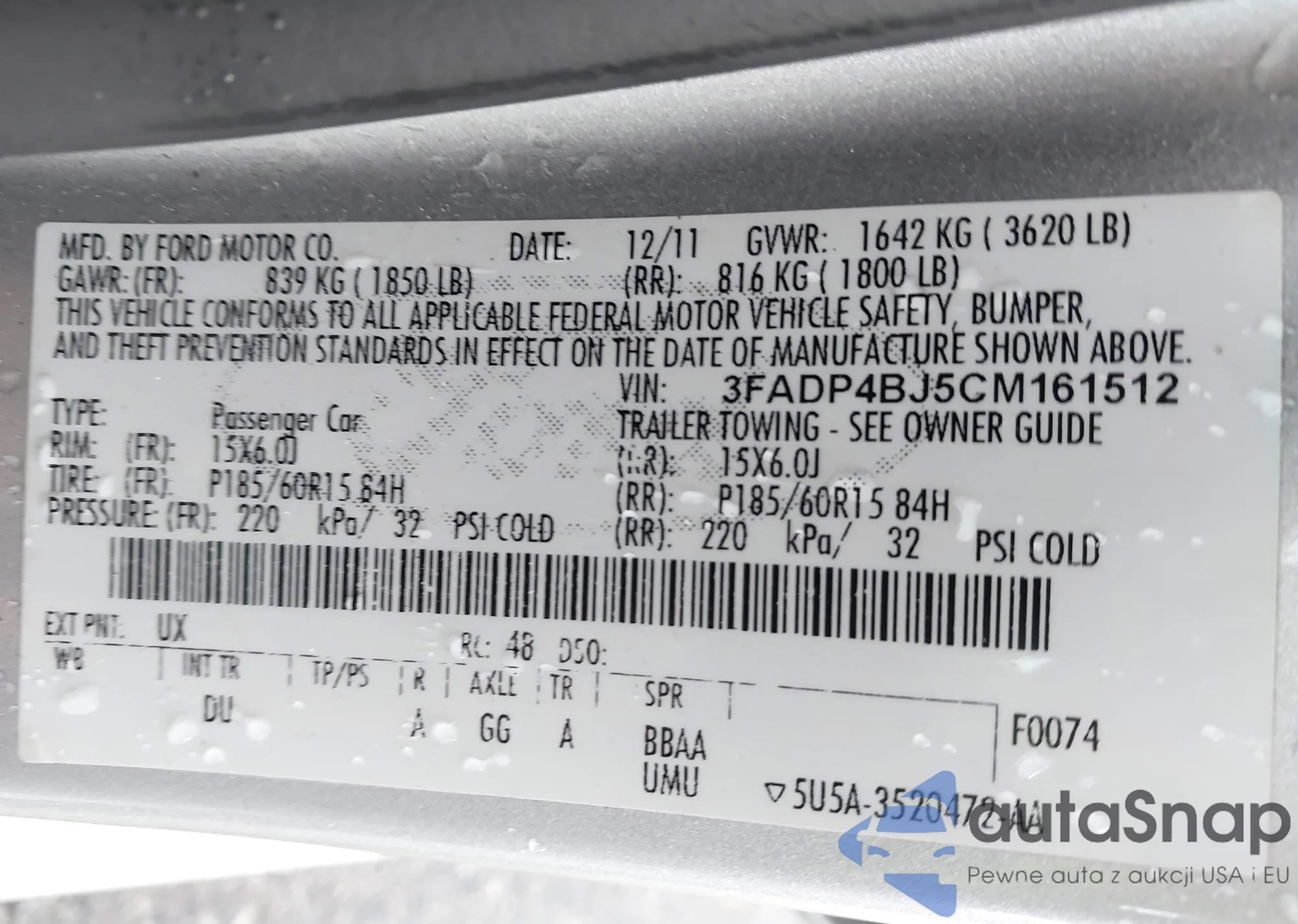 LOT: 43707607 VIN: 3FADP4BJ5CM161512
