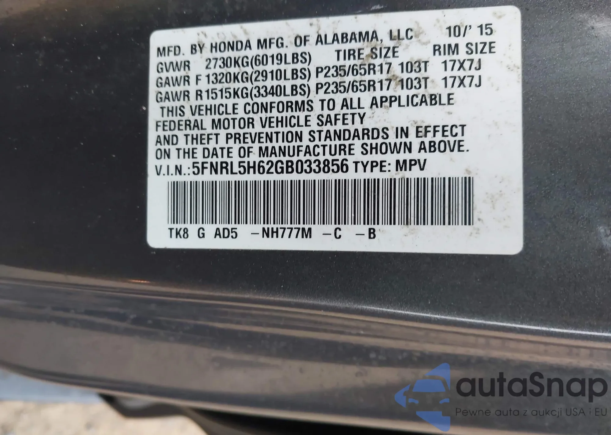 • VIN JHLRD78916C054537