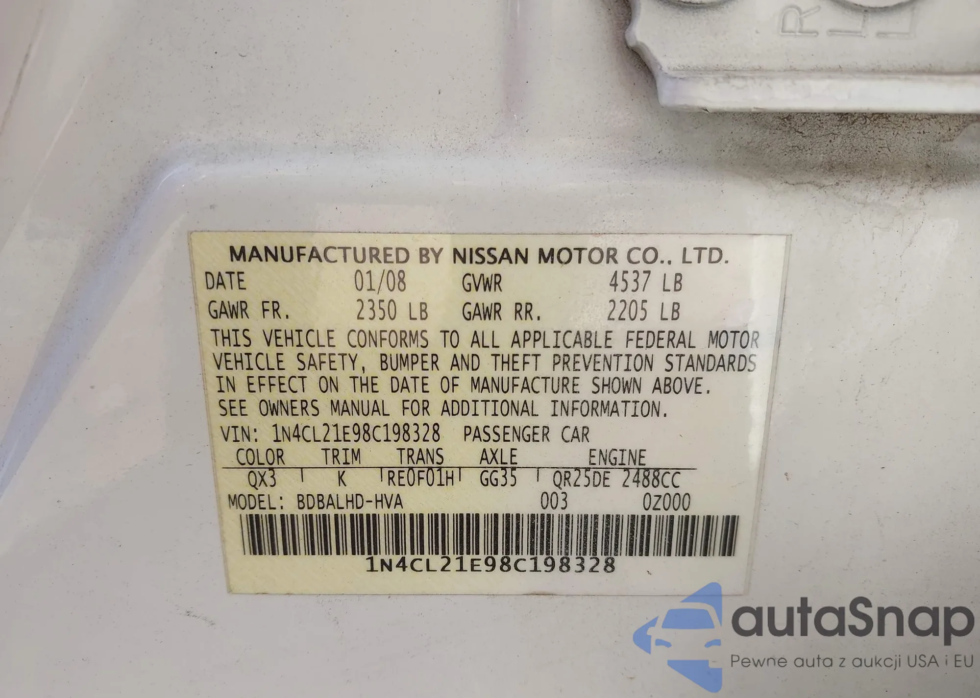 LOT: 43730748 VIN: 1N4CL21E98C198328