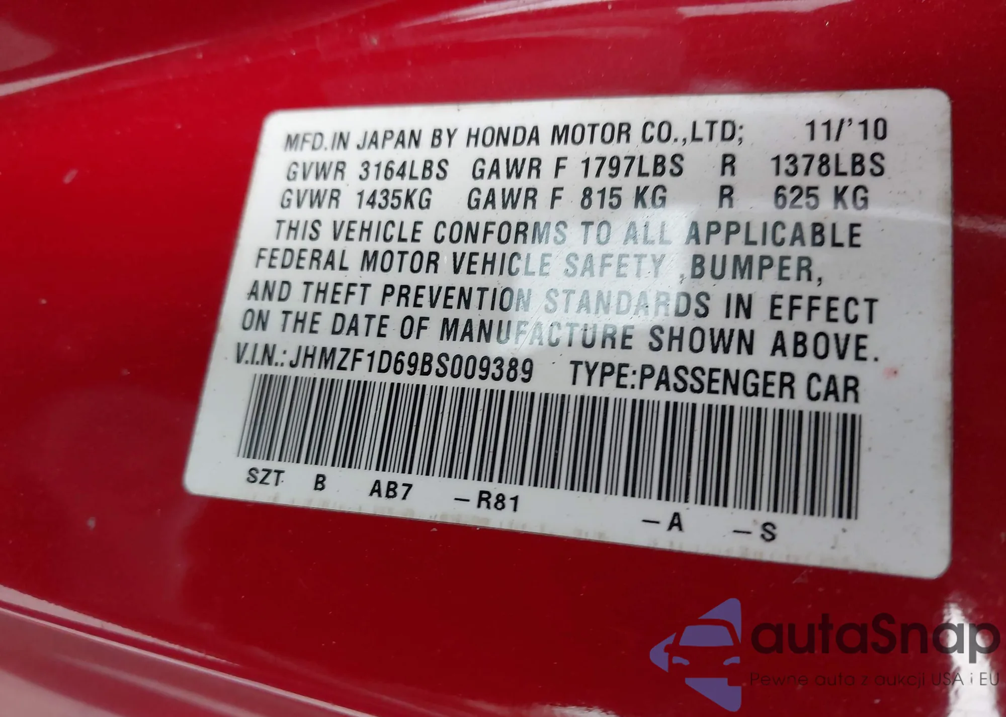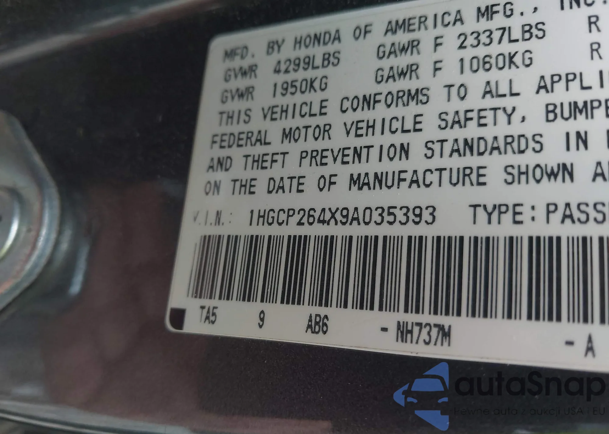 LOT: 43315046 VIN: 1HGCP264X9A035393