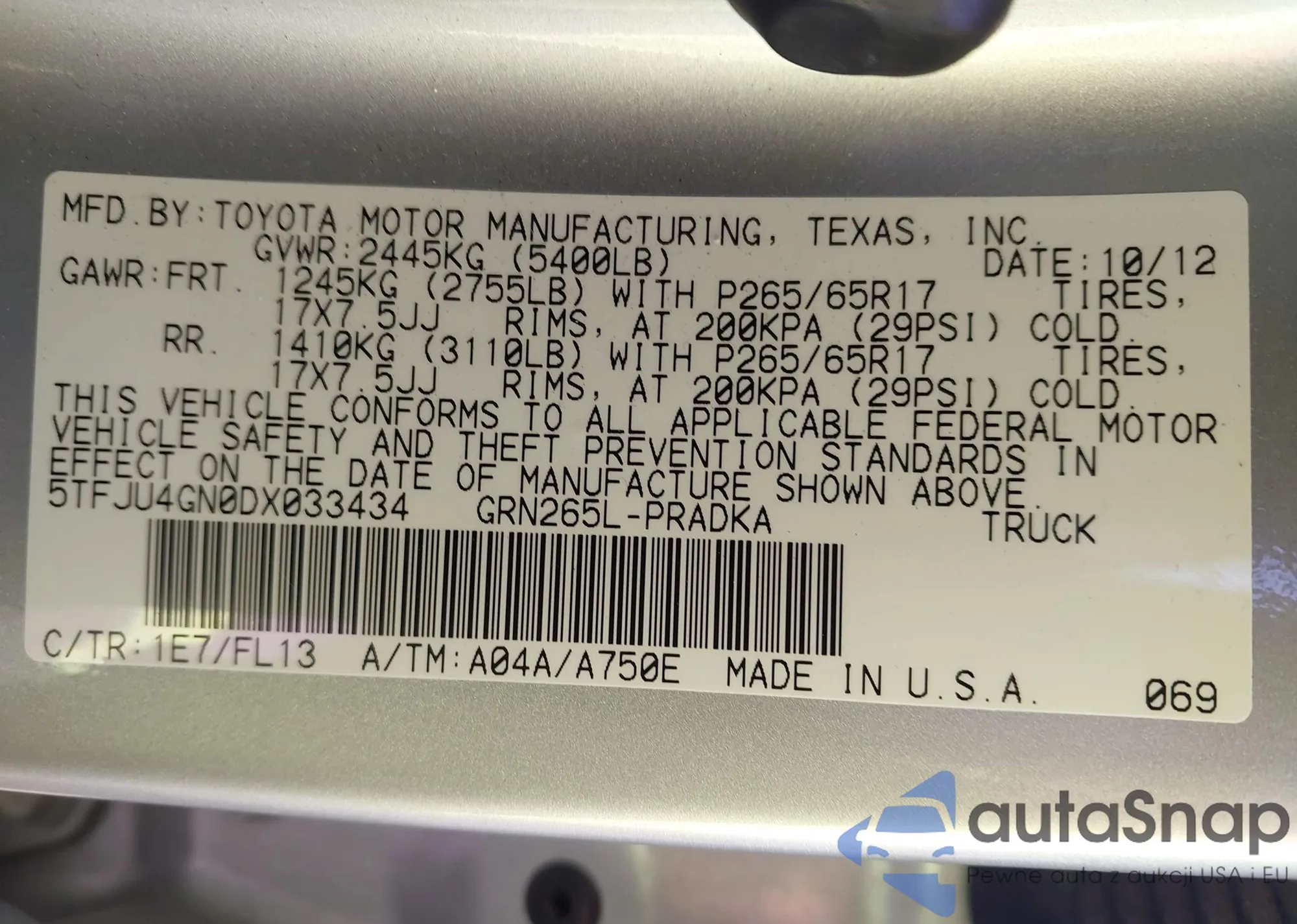 LOT: 43907939 VIN: JTEZU5JR7C5037314