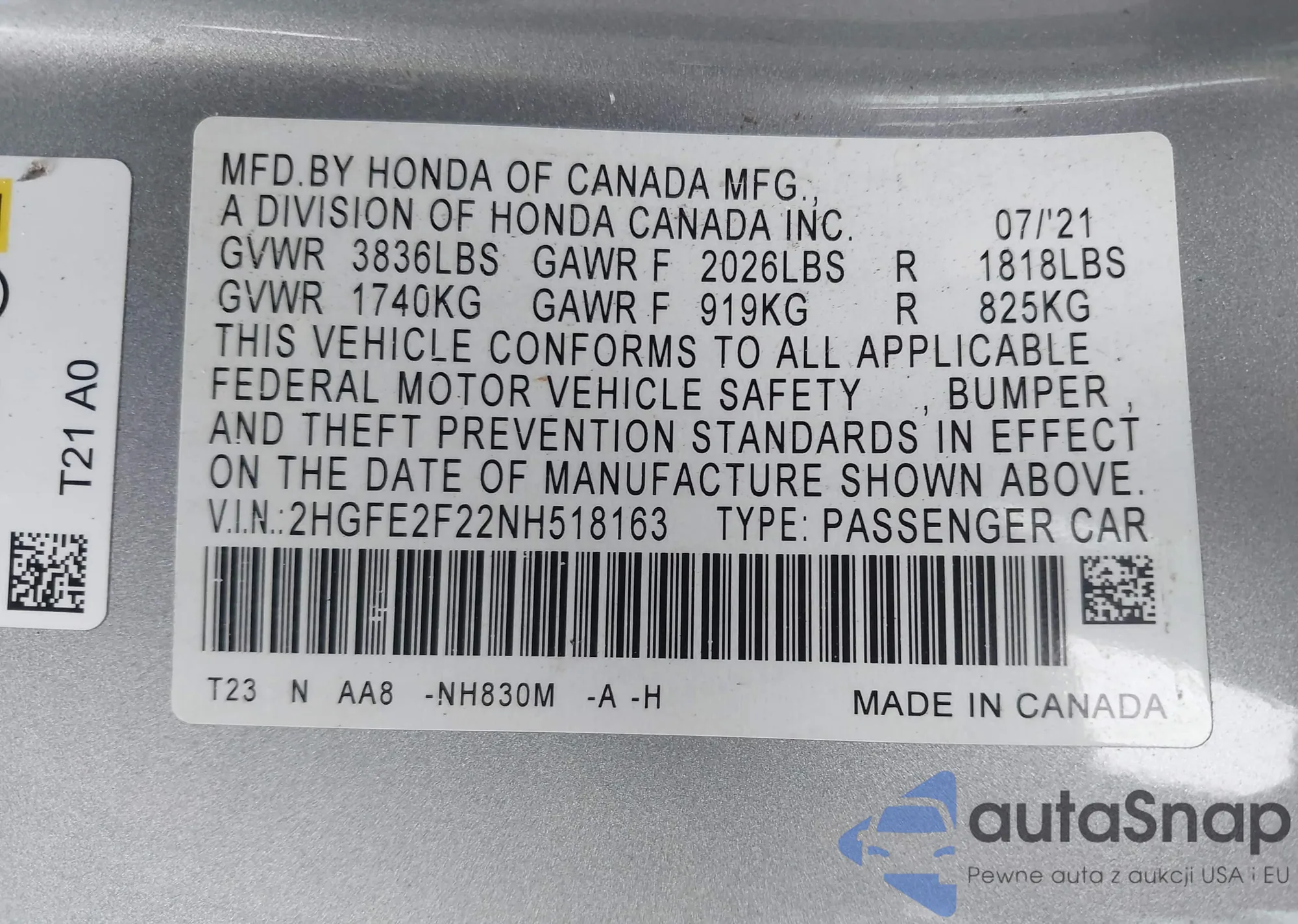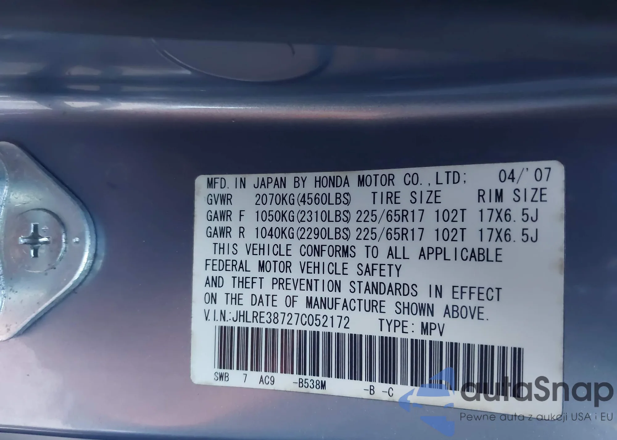 LOT: 43706845 VIN: JHLRE38727C052172