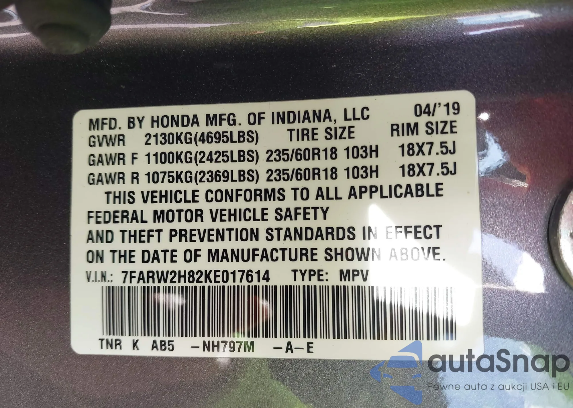 • VIN 7FARW2H82KE017614