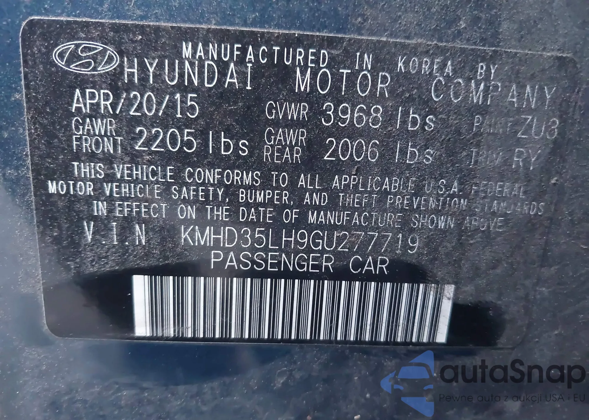 LOT: 43977254 VIN: KMHD35LH9GU277719