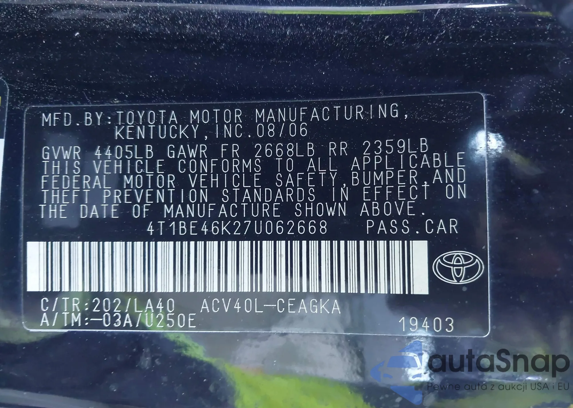 LOT: 43942474 VIN: 4T1BE46K27U062668