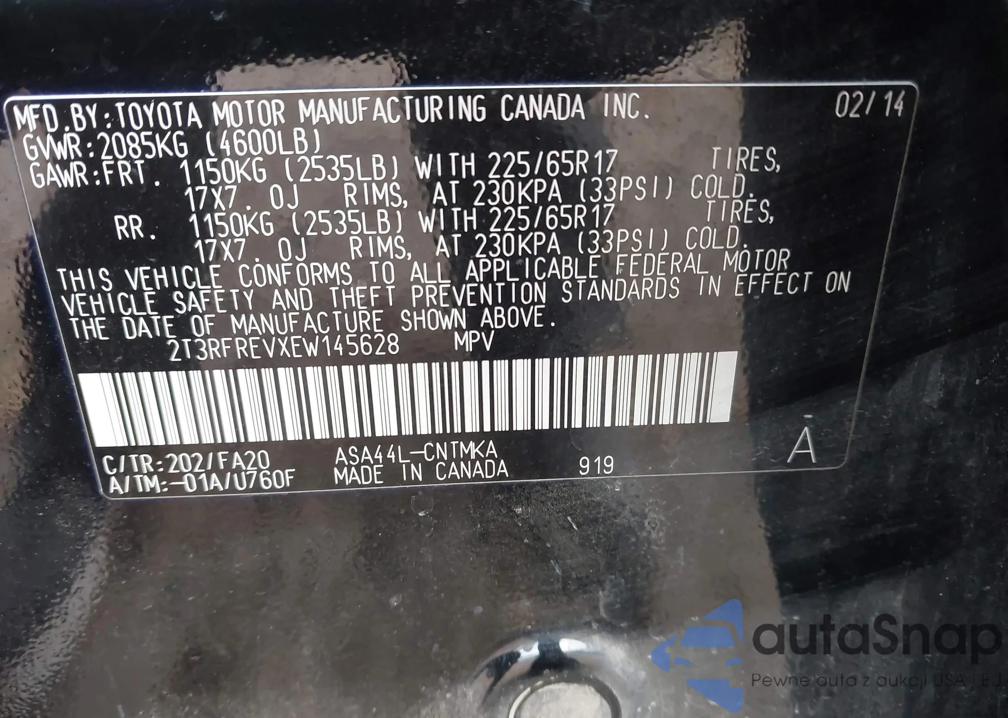 LOT: 43834634 VIN: 2T3RFREVXEW145628
