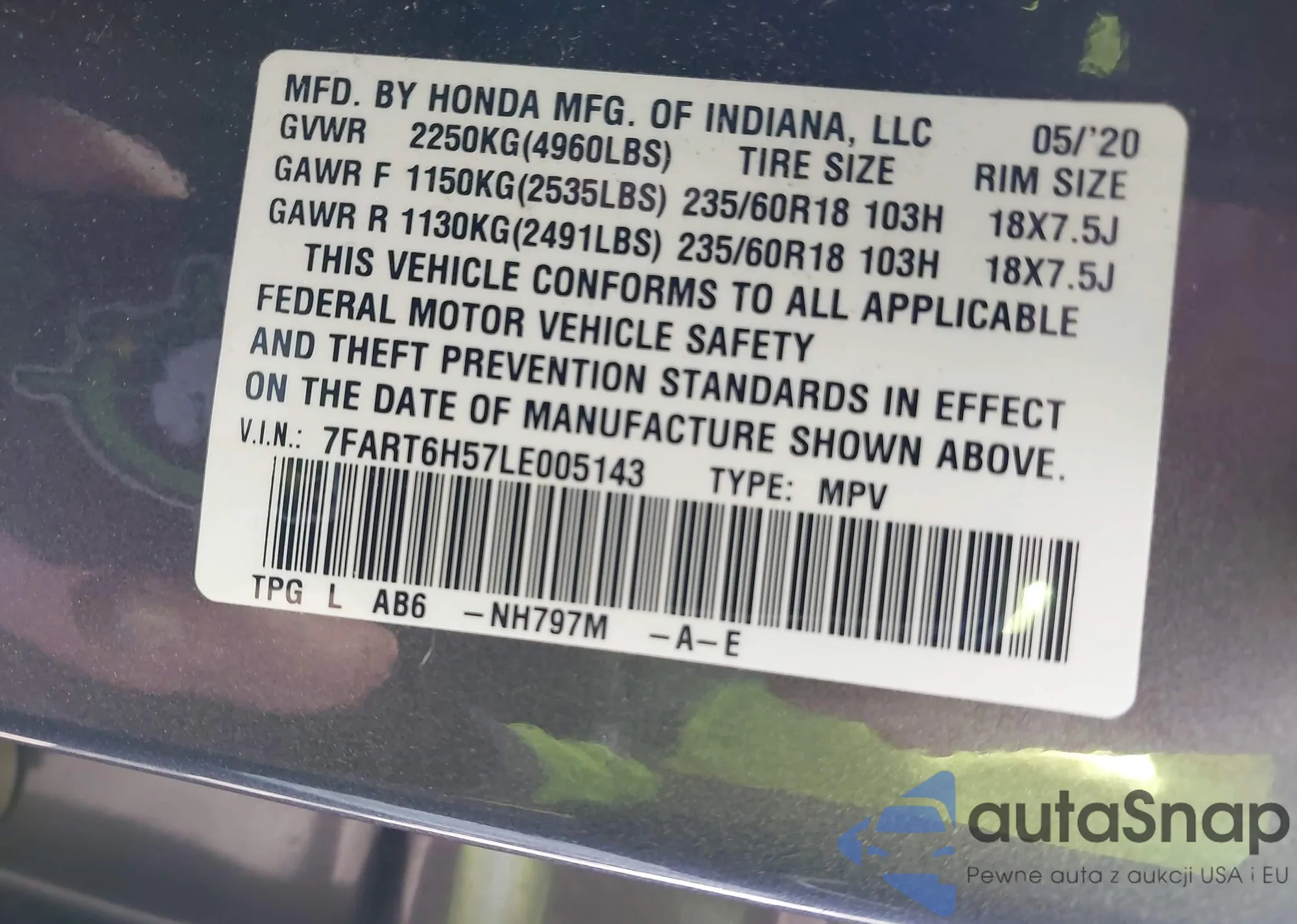 • VIN 5J6RM4H5XDL007507