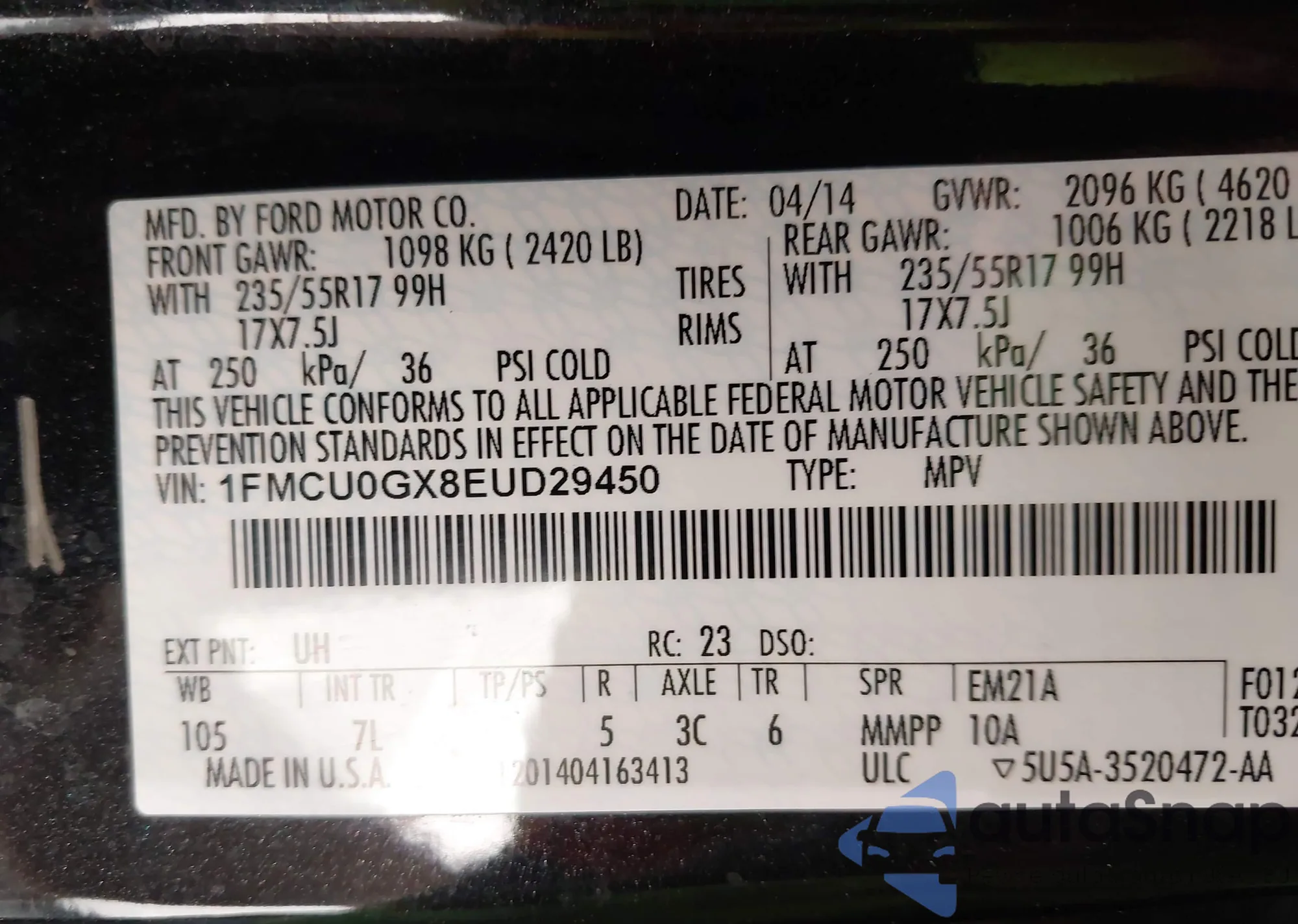 • VIN 1FMCU0GX8EUD29450