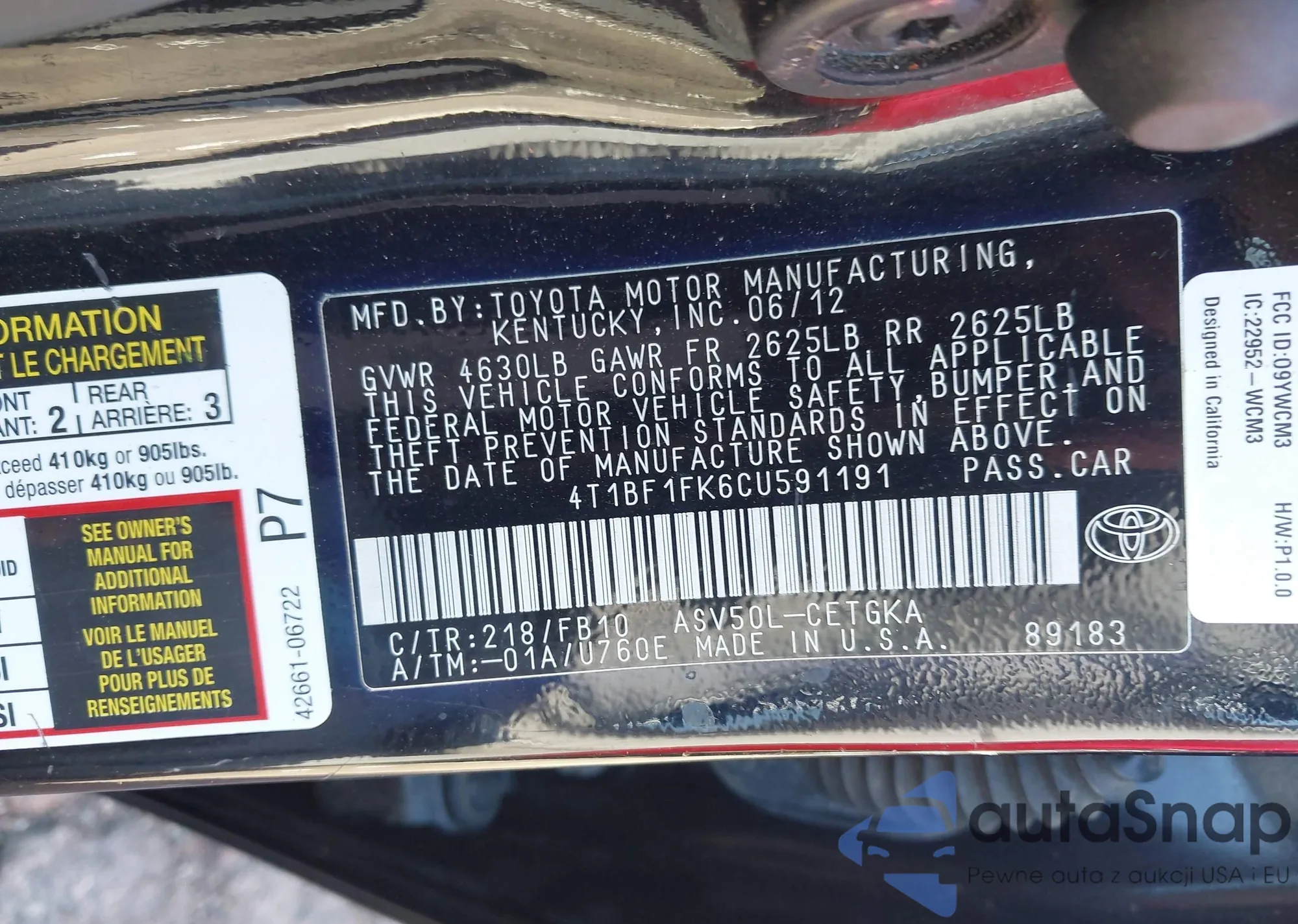 LOT: 43468355 VIN: 4T1BF1FK6CU591191