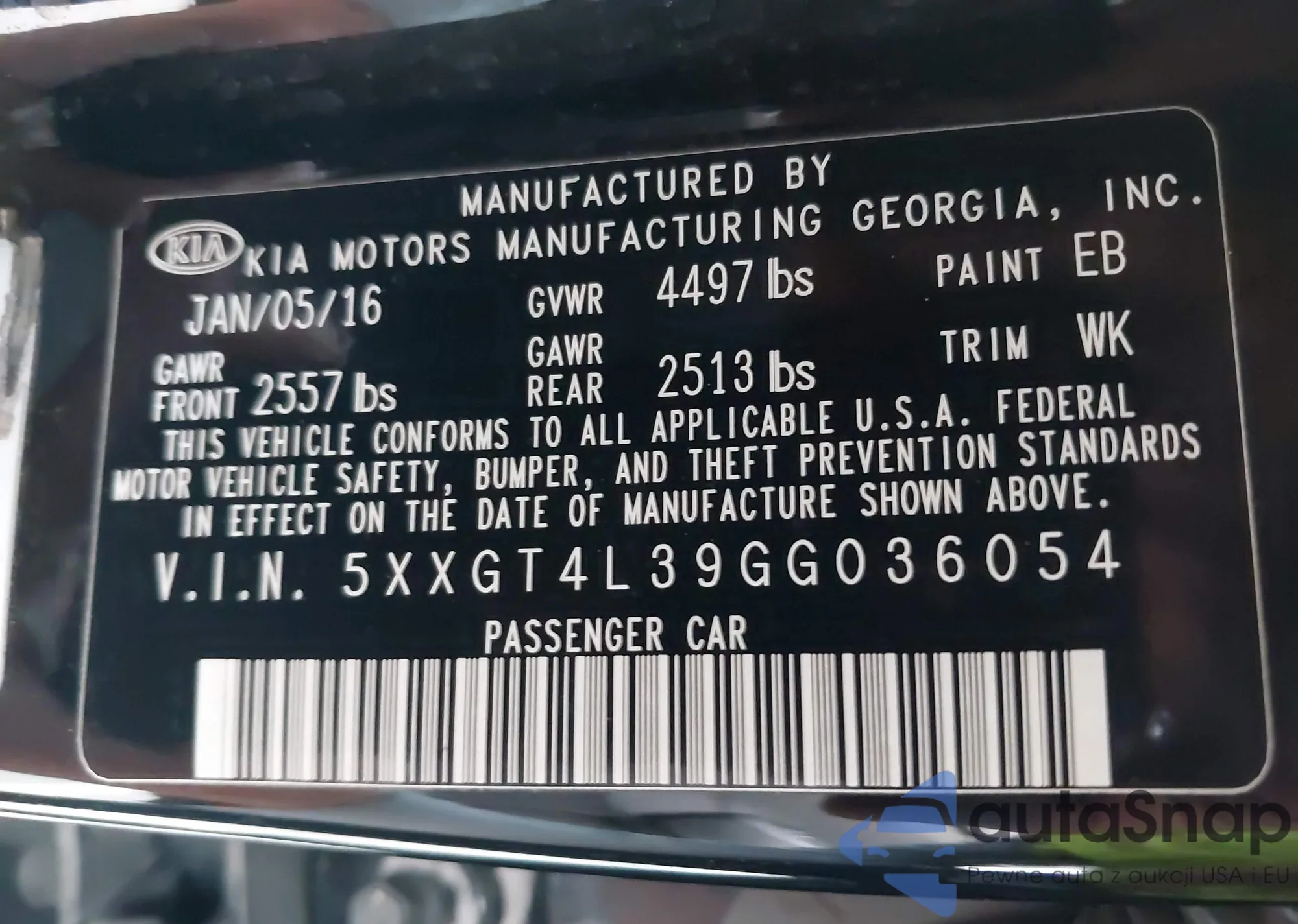 LOT: 44053523 VIN: 5XXGT4L39GG036054