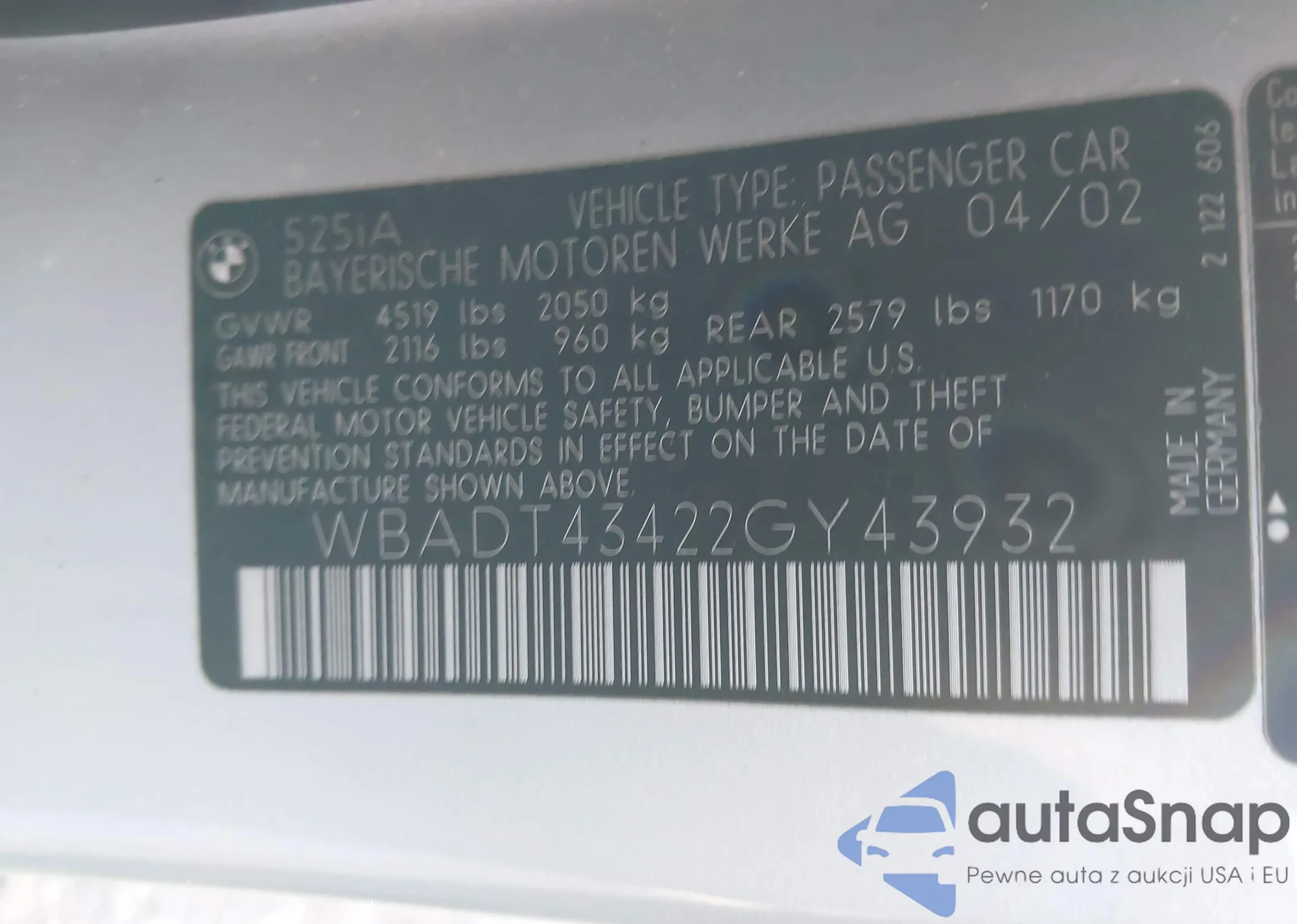 2002 BMW 525Ia from USA, damaged, VIN WBADT43422GY43932