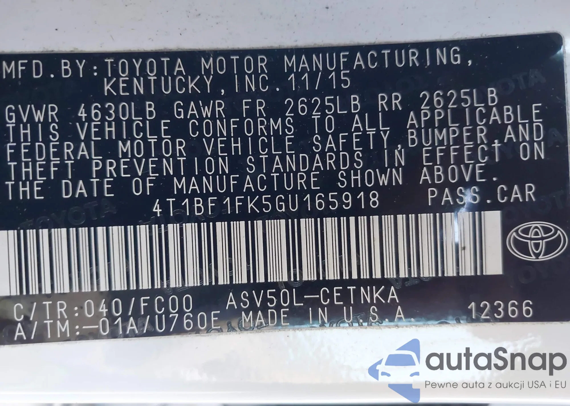 • VIN 4T1BF1FK5GU165918