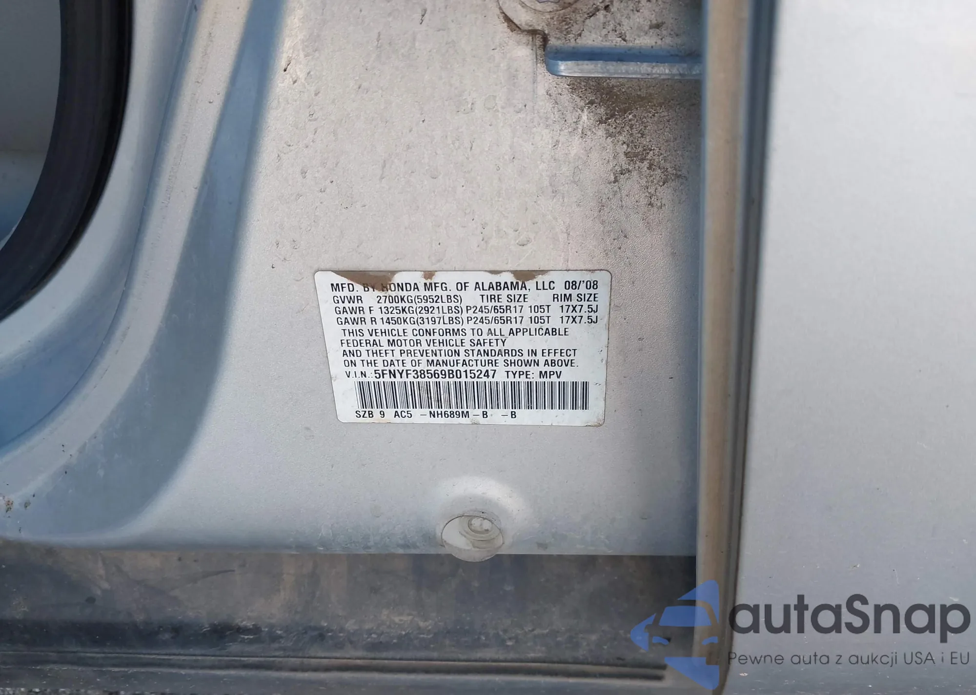LOT: 44066889 VIN: 5FNYF38569B015247