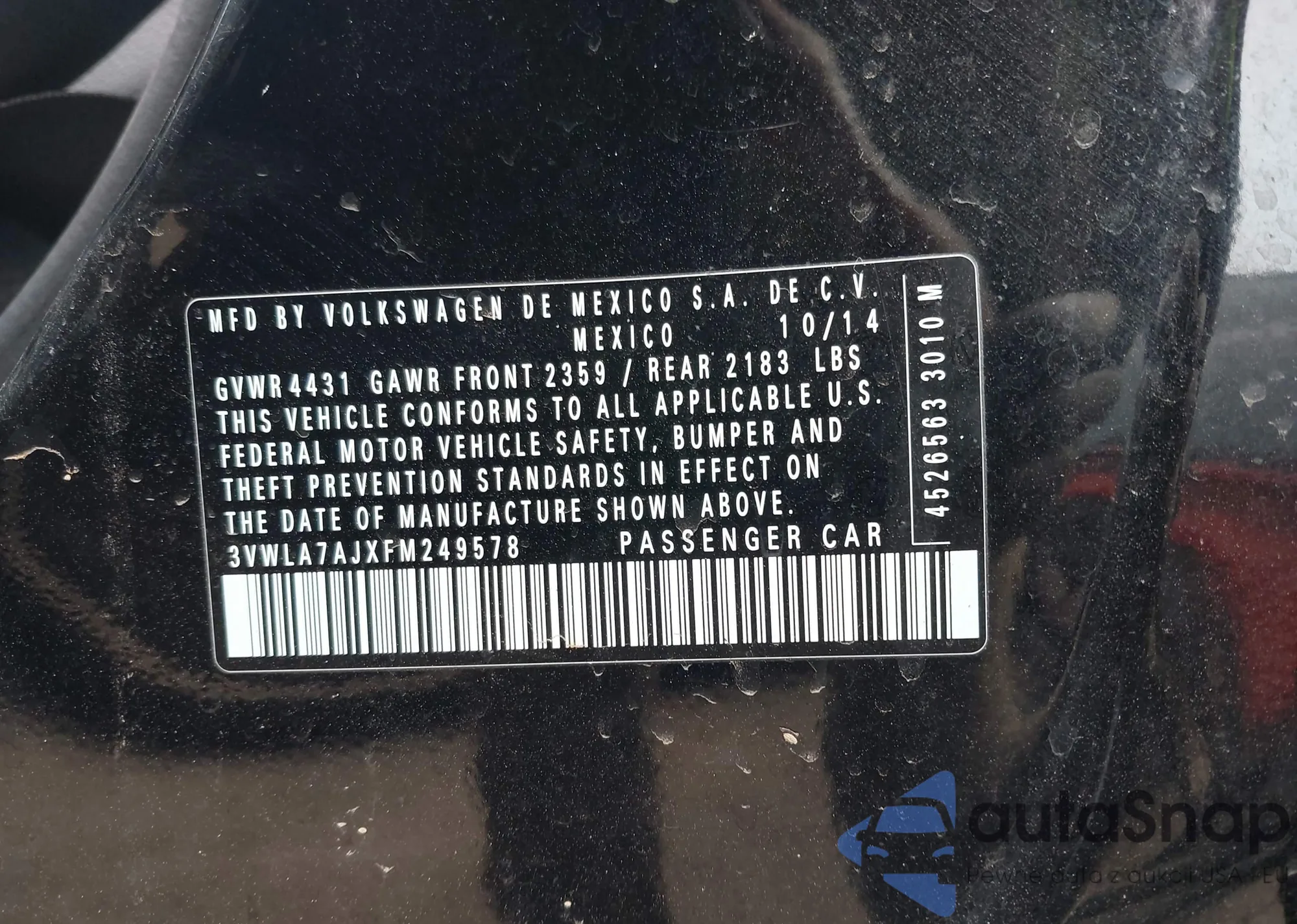 • VIN 3VWLA7AJXFM249578