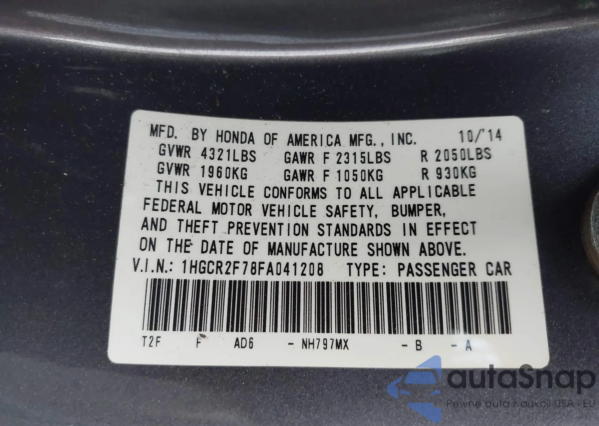 • VIN 1HGCR2F78FA041208