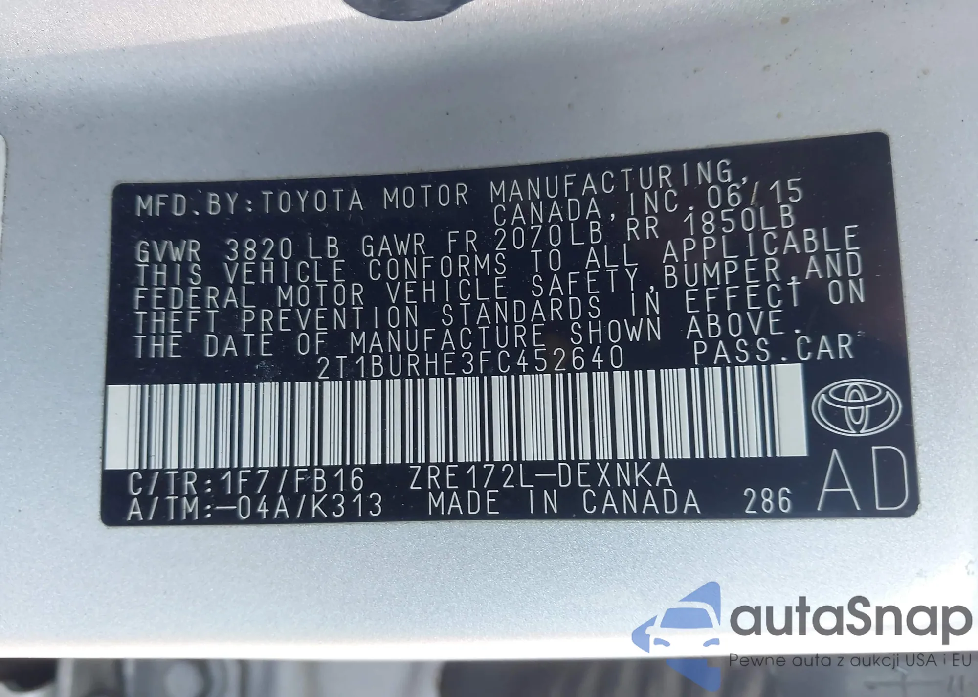 • VIN 2T1BURHE3FC452640