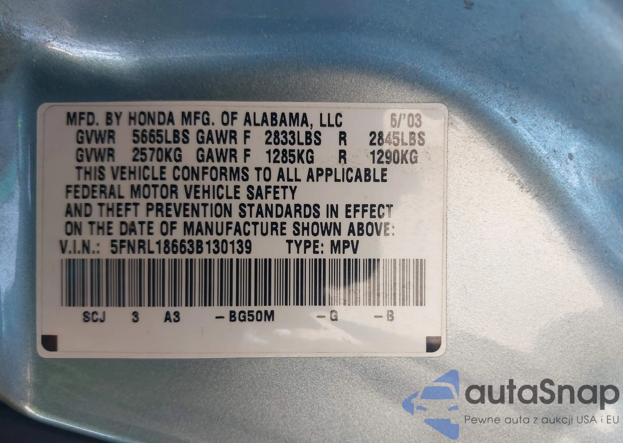 • VIN 5FNRL18663B130139