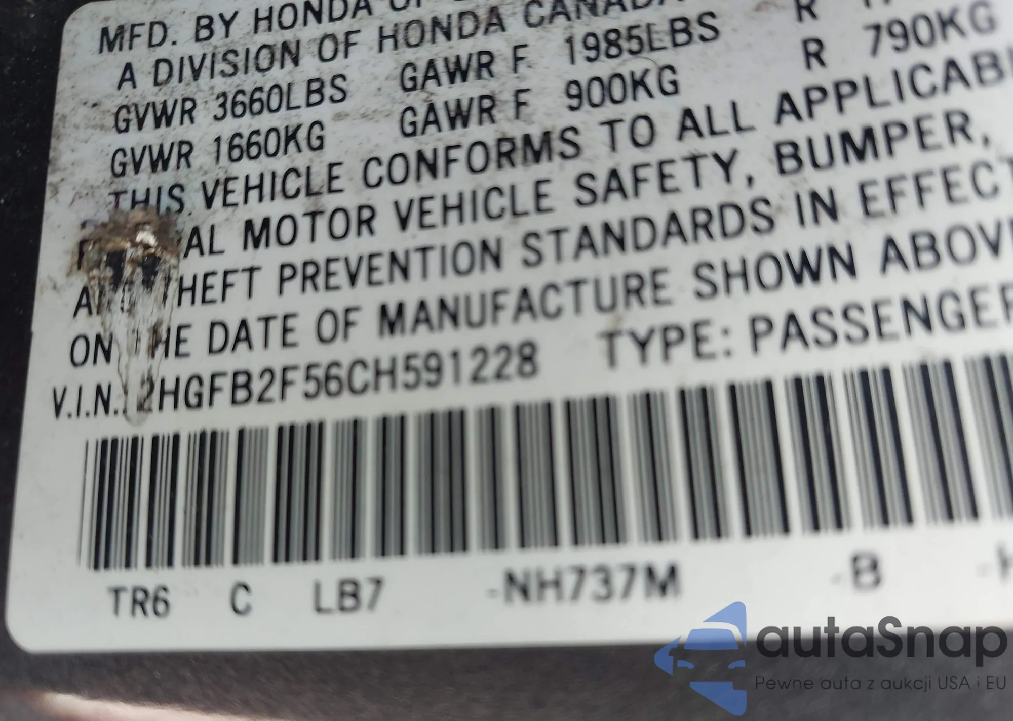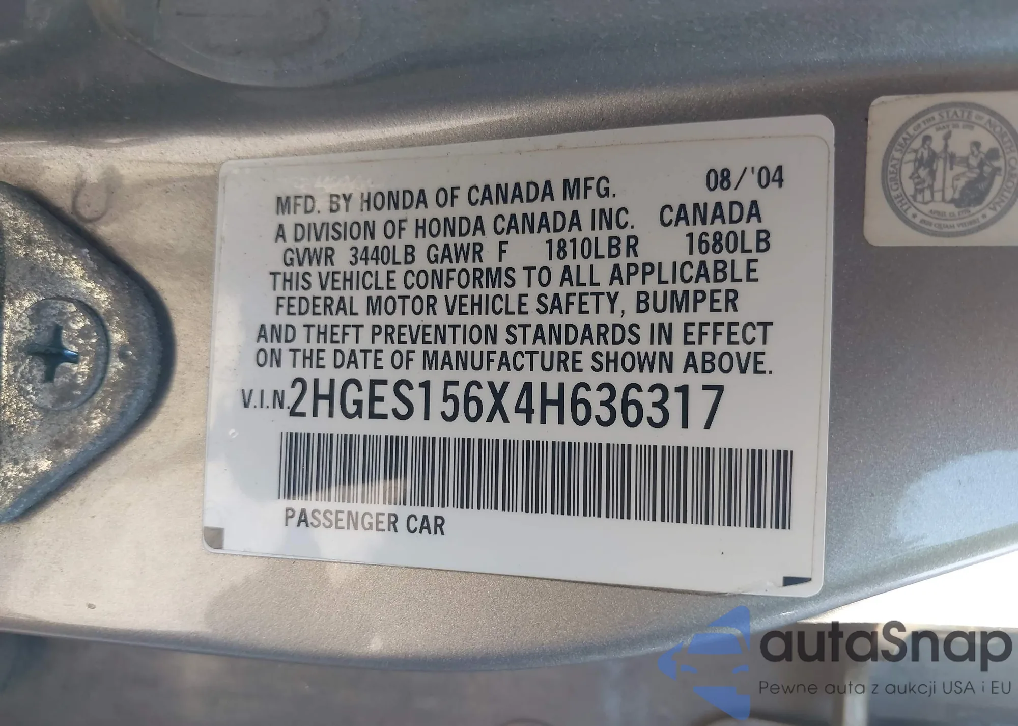 LOT: 42552754 VIN: 2HGES156X4H636317
