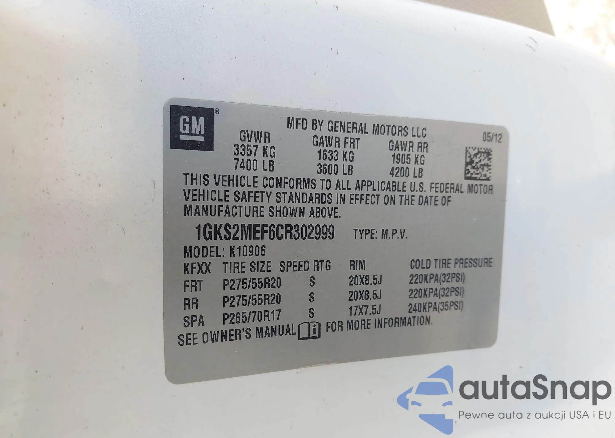 LOT: 43687288 VIN: 1GKS2MEF6CR302999