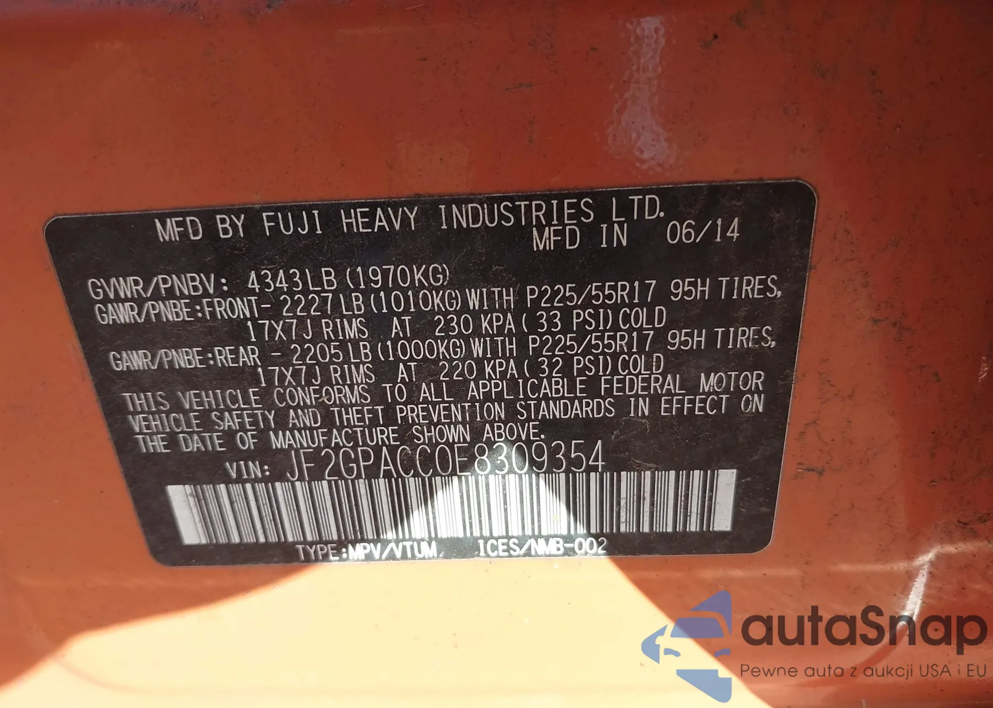 LOT: 43586061 VIN: JF2GPACC0E8309354