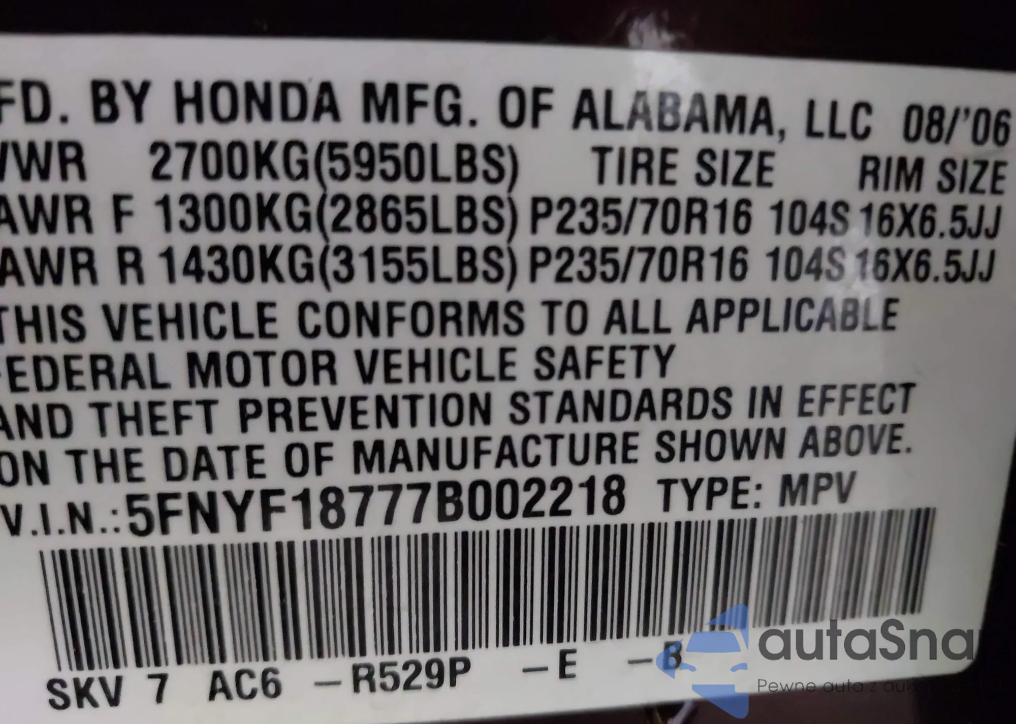 • VIN 5FNYF18777B002218