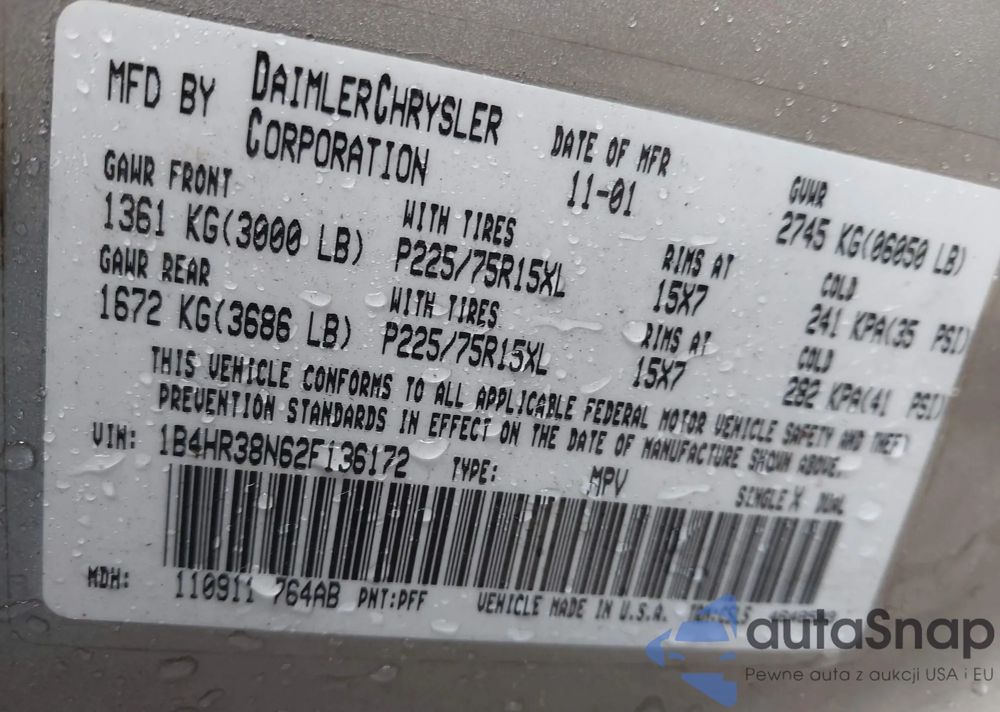 LOT: 43961969 VIN: 1B4HR38N62F136172