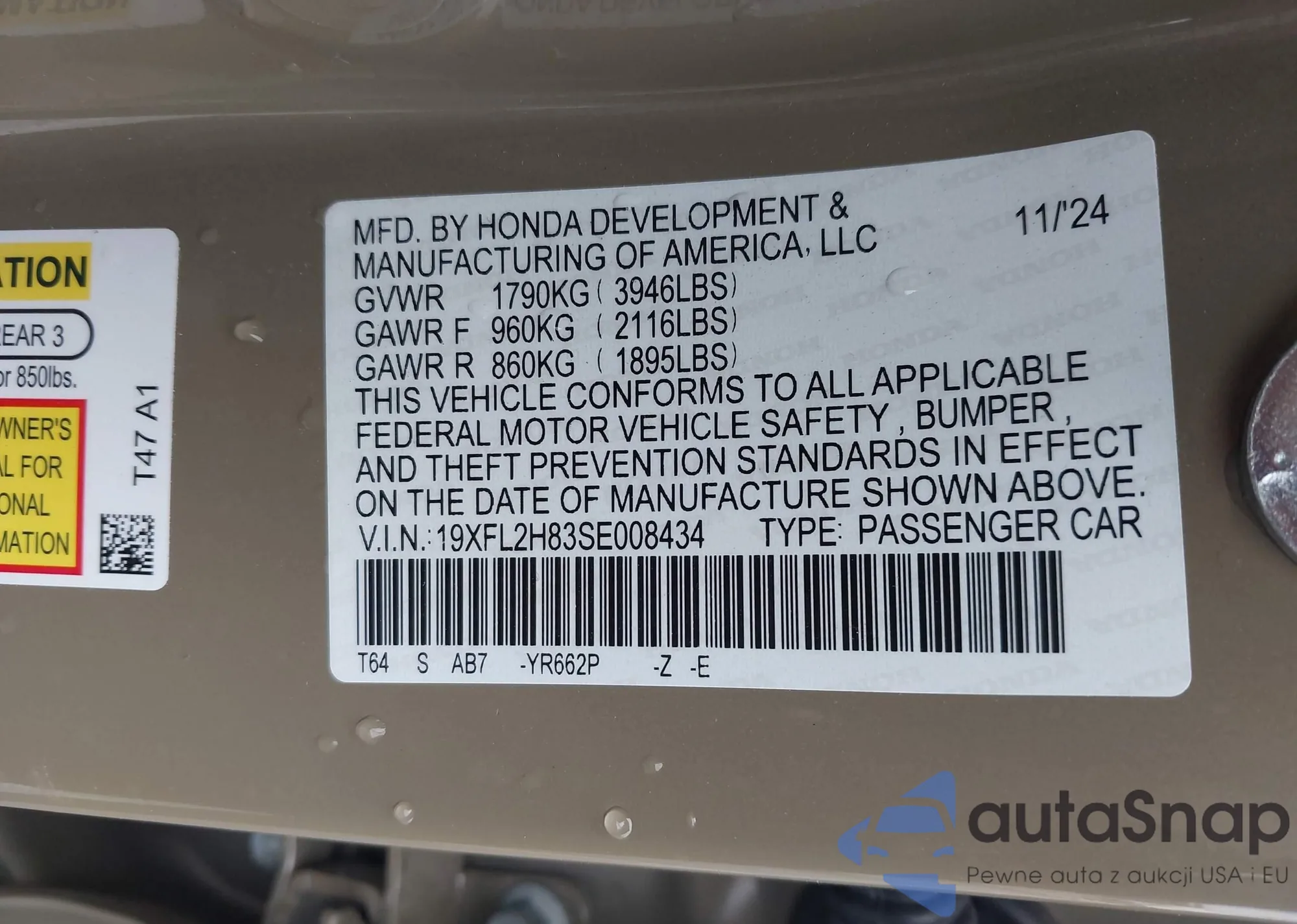 LOT: 43790006 VIN: 19XFL2H83SE008434