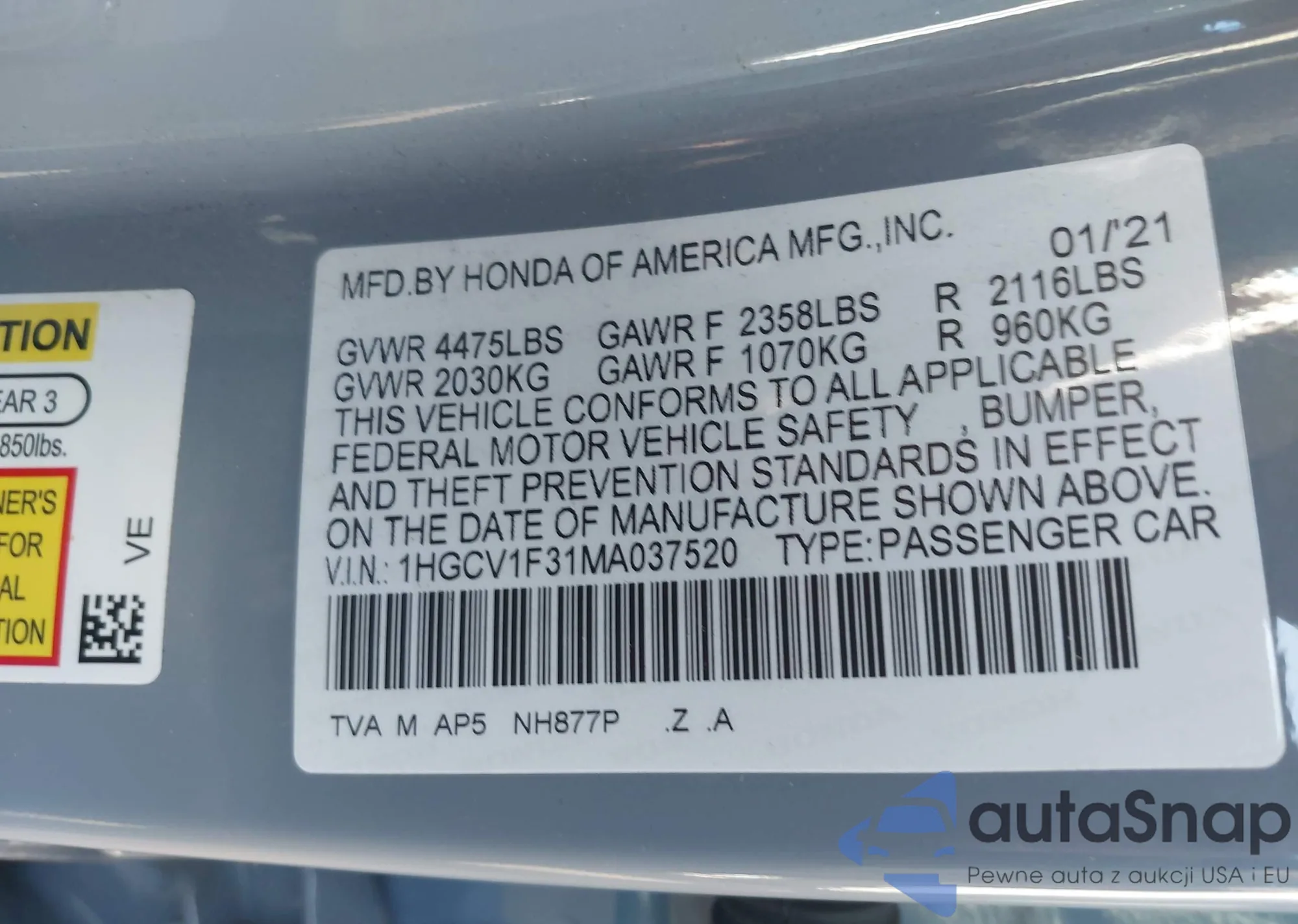 • VIN 1HGCV1F31MA037520
