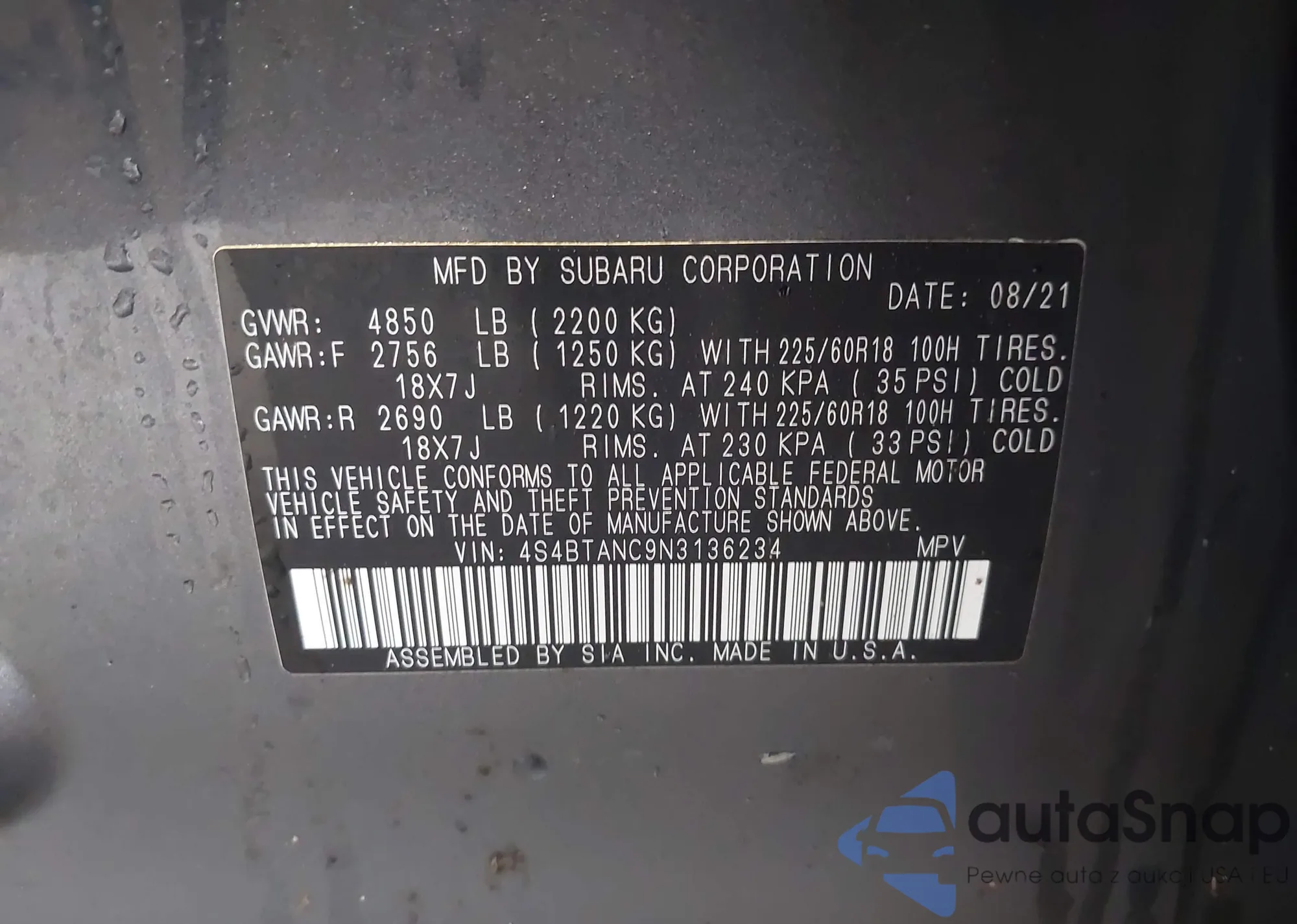 LOT: 43717998 VIN: JF2GTABC4MH203839