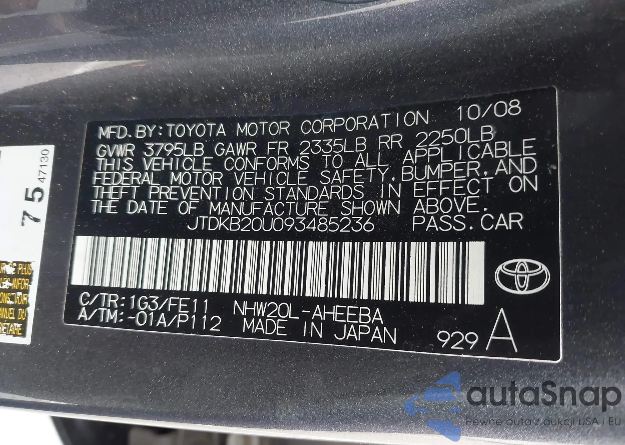 LOT: 43750714 VIN: JTDKB20U093485236