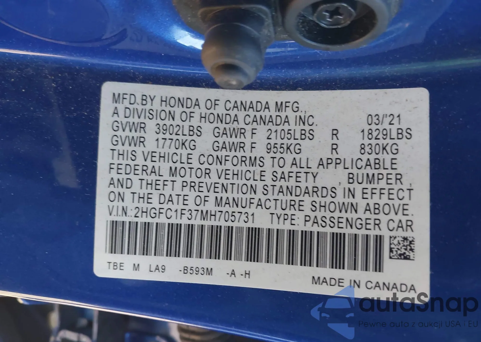 LOT: 43702630 VIN: 1HGCV2F3XLA012622