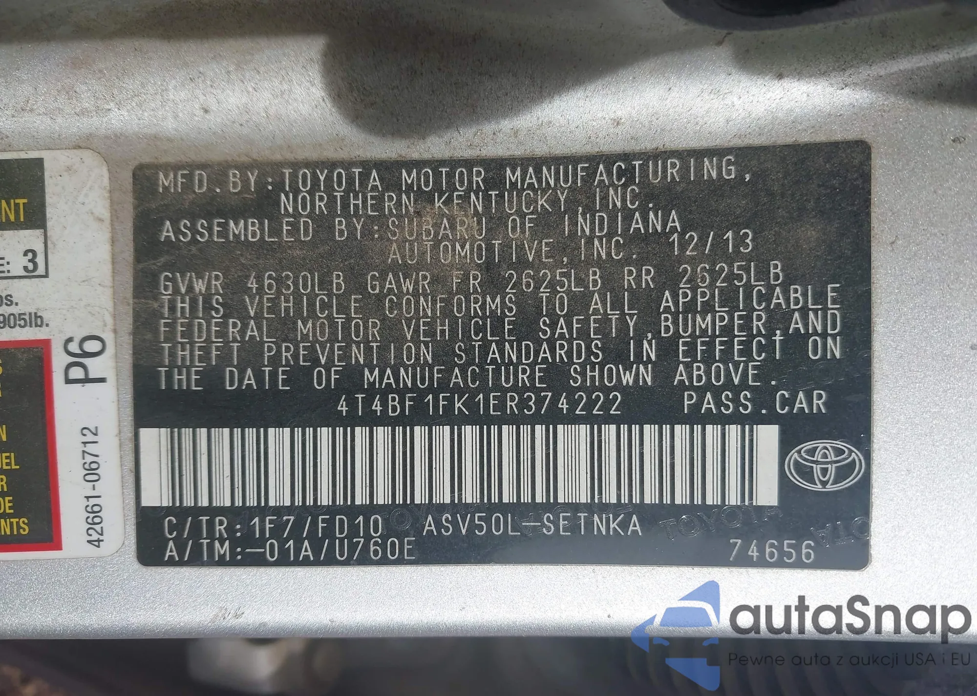 • VIN 4T4BF1FK1ER374222