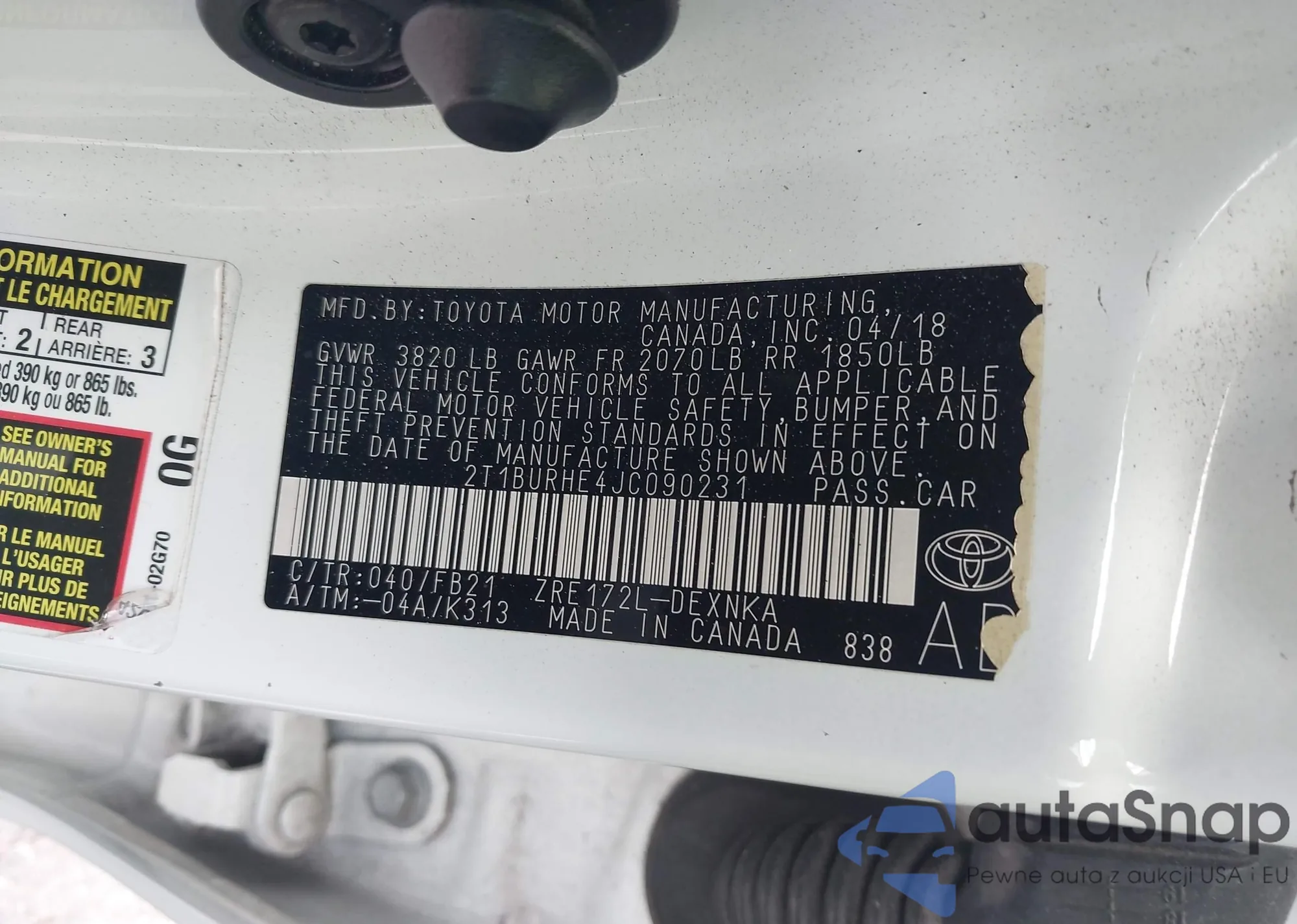 LOT: 43756523 VIN: 2T1BURHE4JC090231