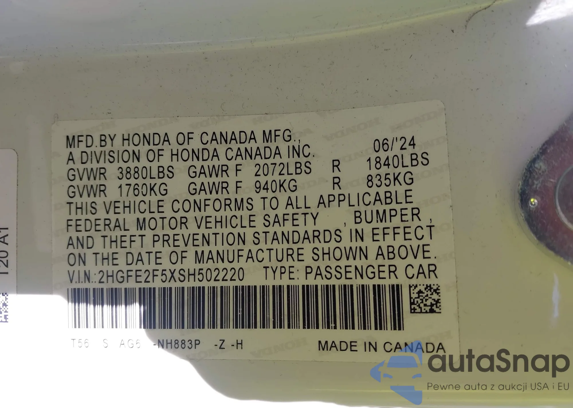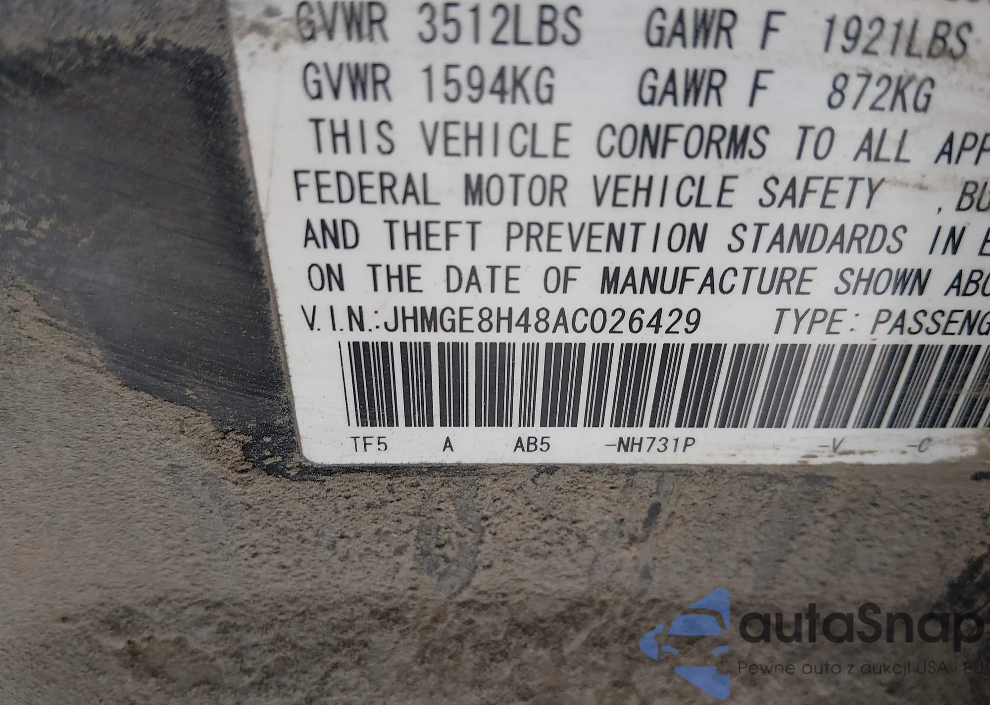 LOT: 43838376 VIN: JHMGE8H48AC026429