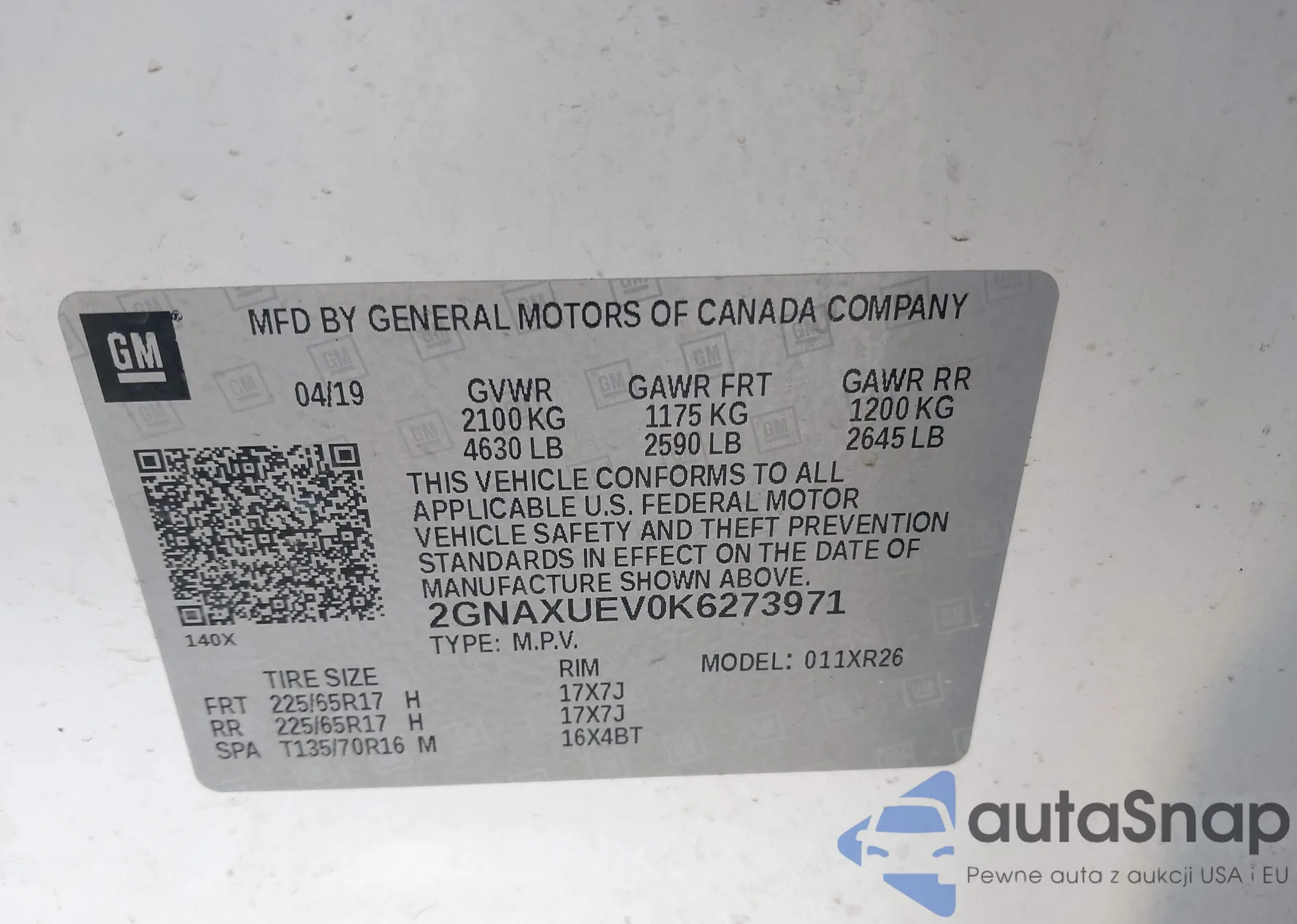 LOT: 43646013 VIN: 2GNAXUEV0K6273971