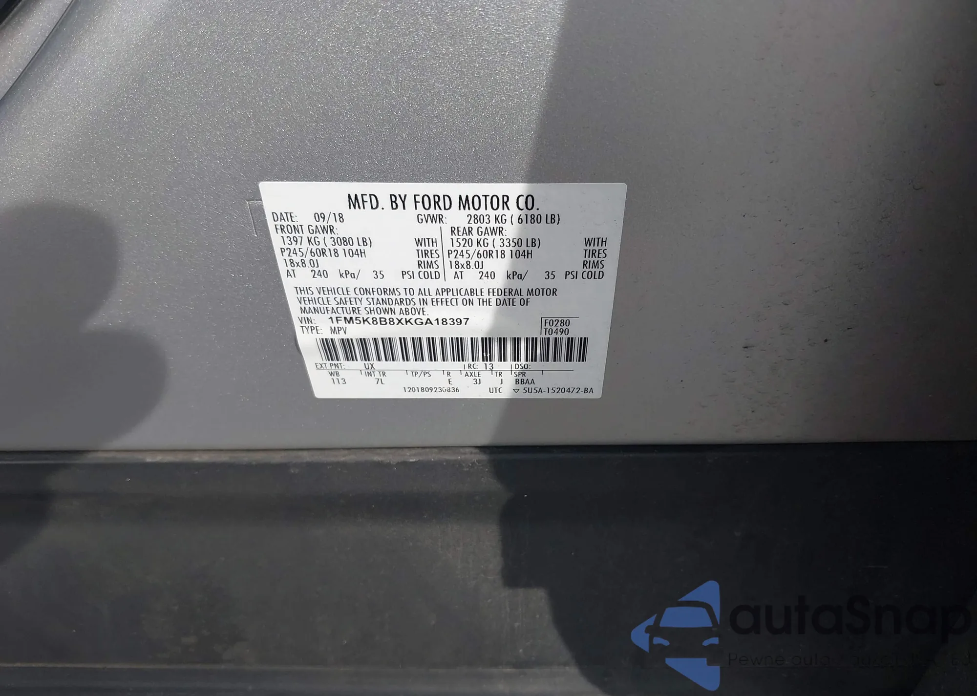 • VIN 1FM5K8B8XKGA18397