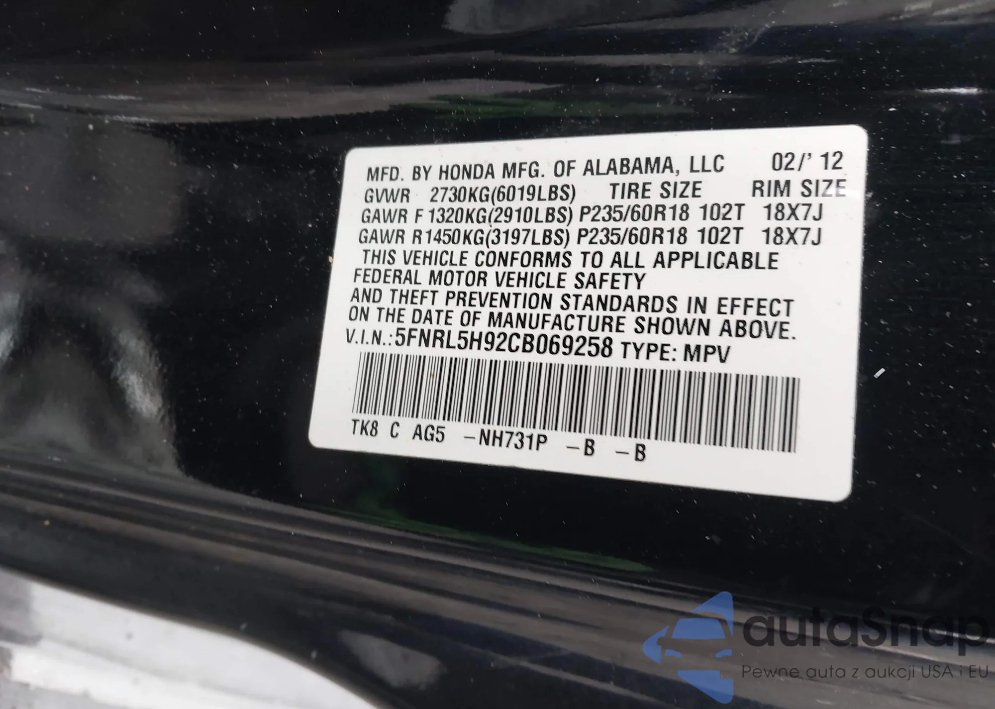 • VIN 5FNRL5H92CB069258