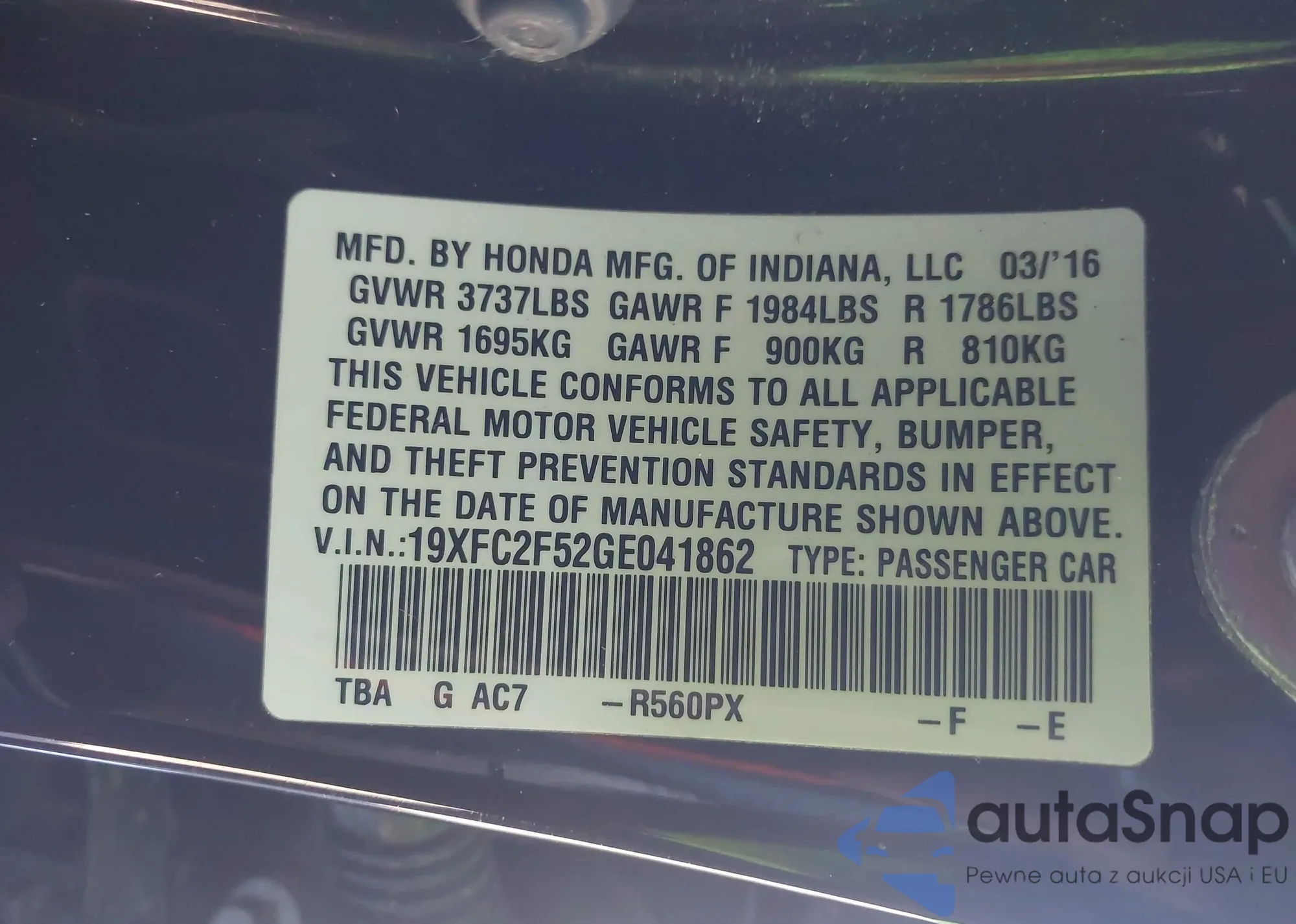 • VIN 19XFC1F37GE015878