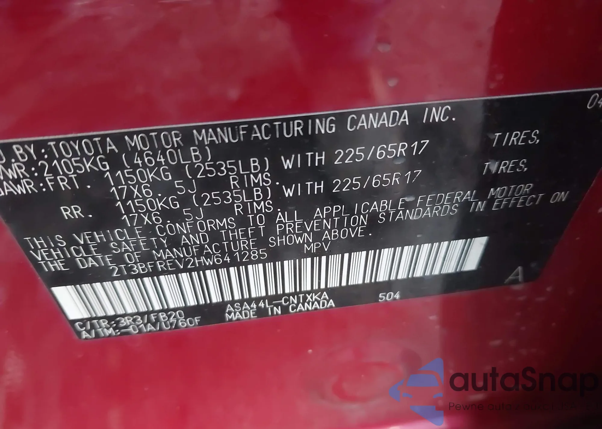 LOT: 43813891 VIN: 2T3BFREV2HW641285