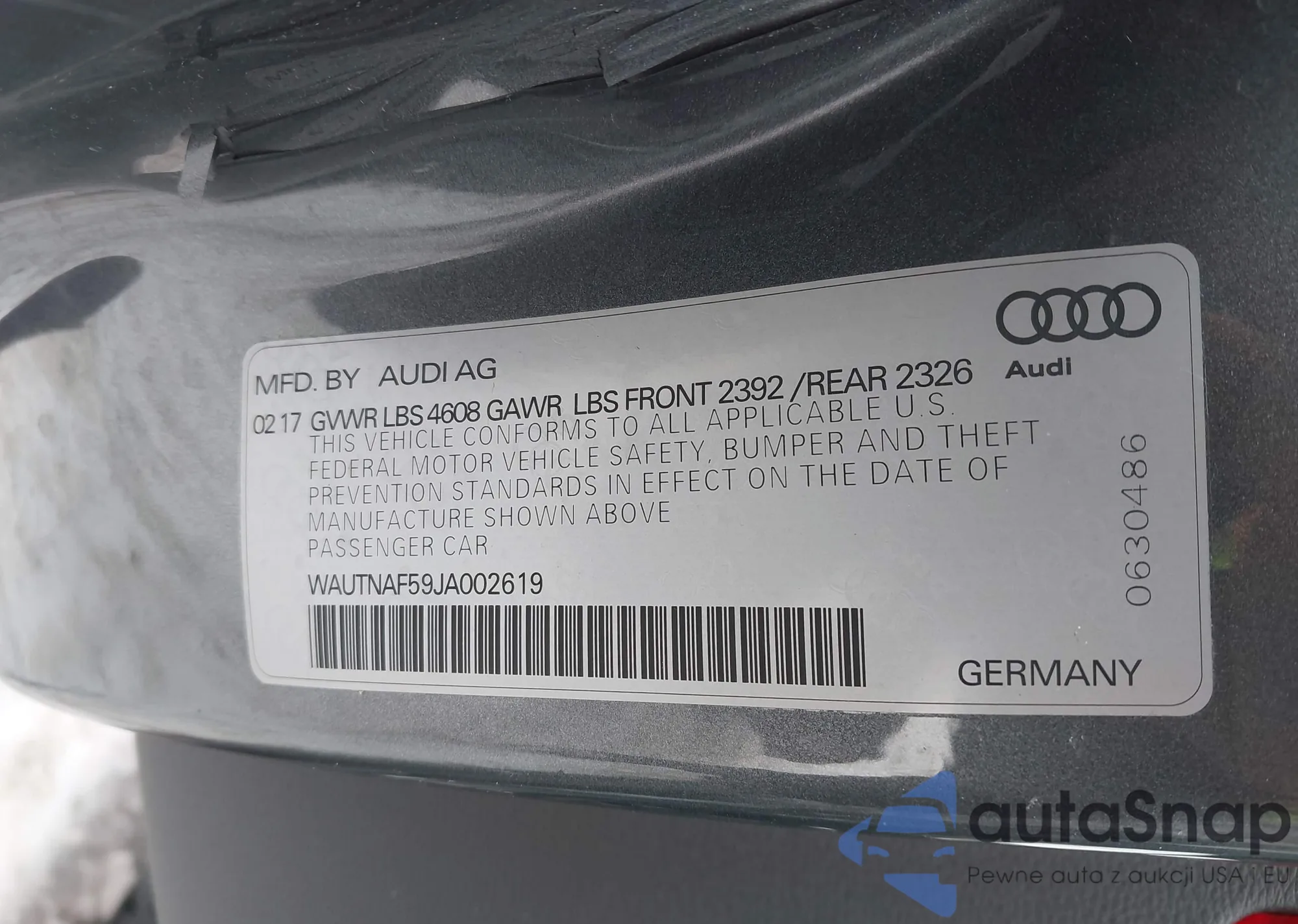 LOT: 43891519 VIN: WAUTNAF59JA002619