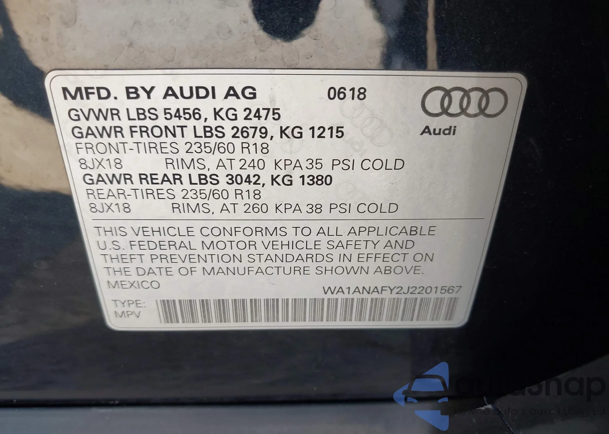 LOT: 43951095 VIN: WA1ANAFY2J2201567