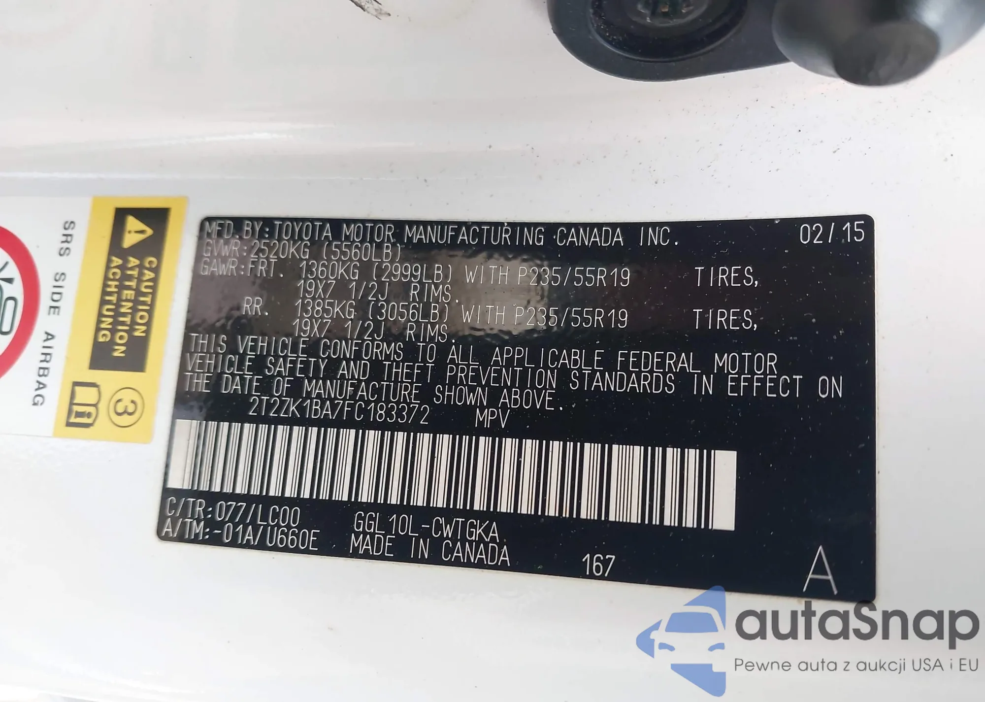• VIN 2T2ZK1BA7FC183372