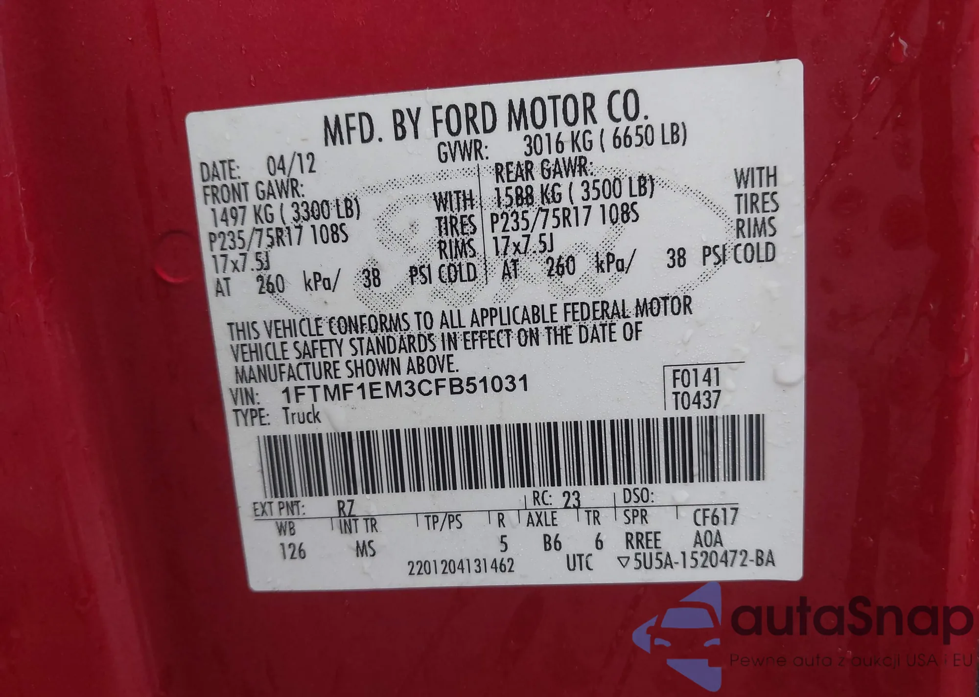 LOT: 43955930 VIN: 1FTMF1EM3CFB51031