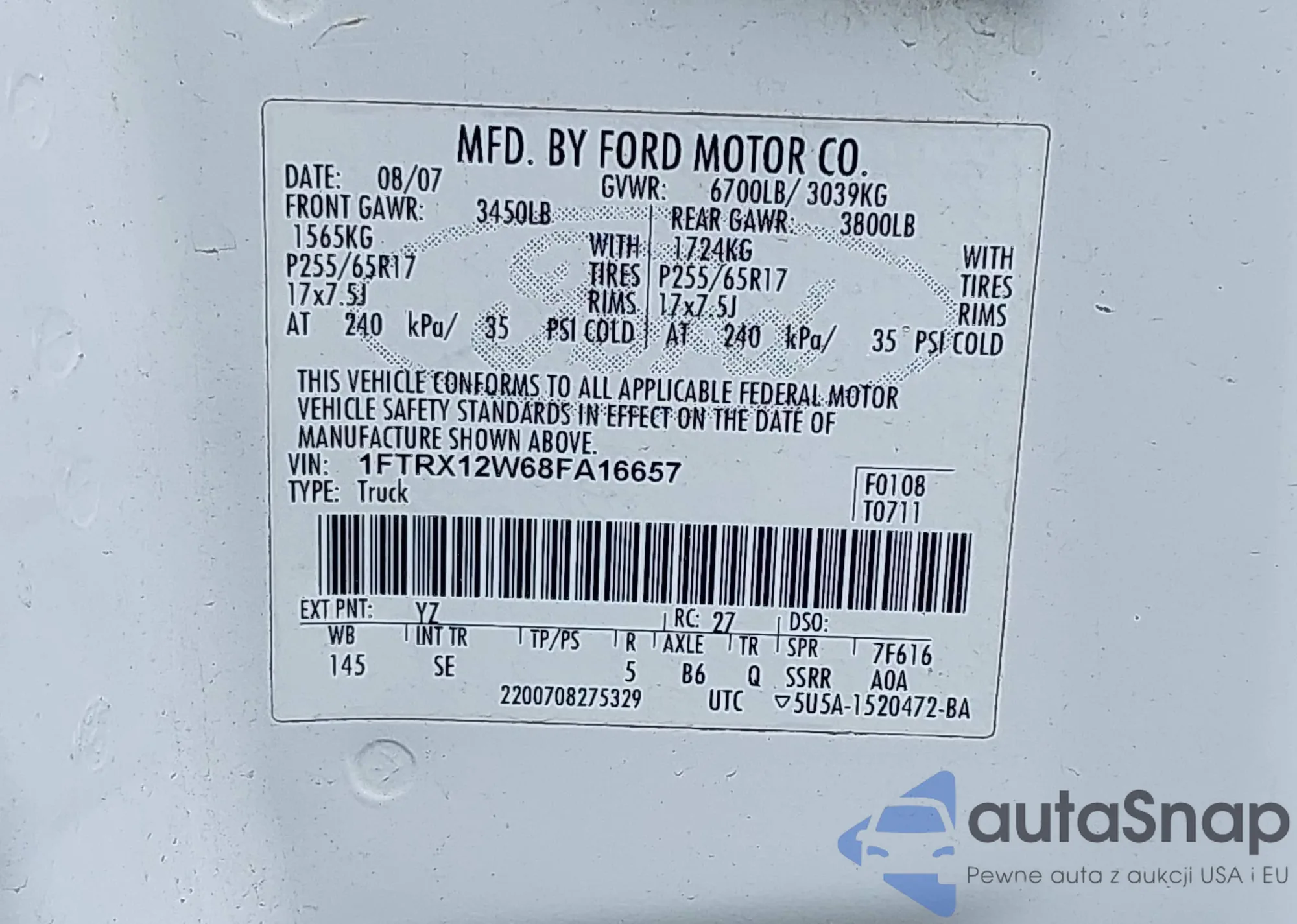 • VIN 1FTRX12W68FA16657