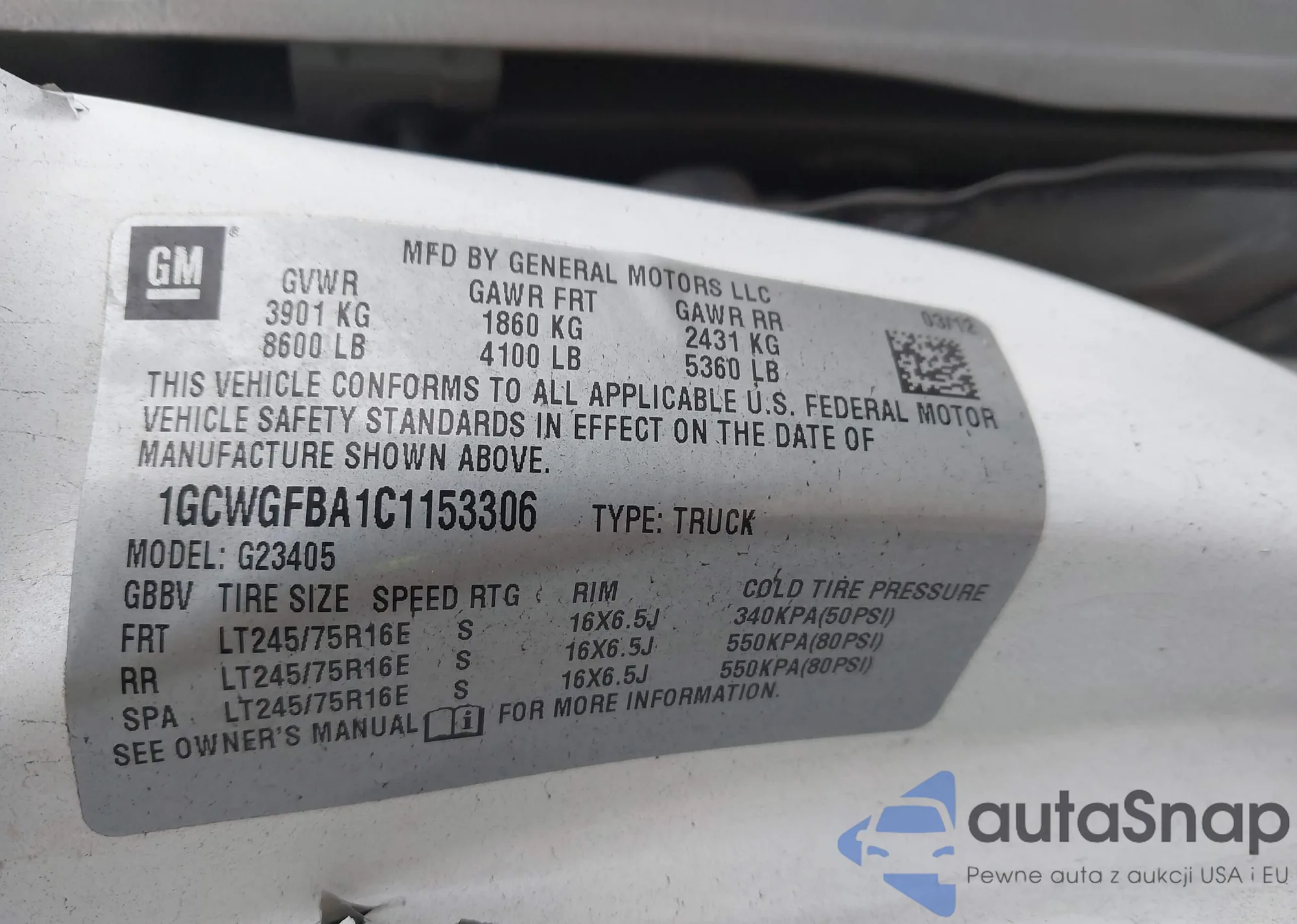 LOT: 43688920 VIN: 1GCWGFBA1C1153306