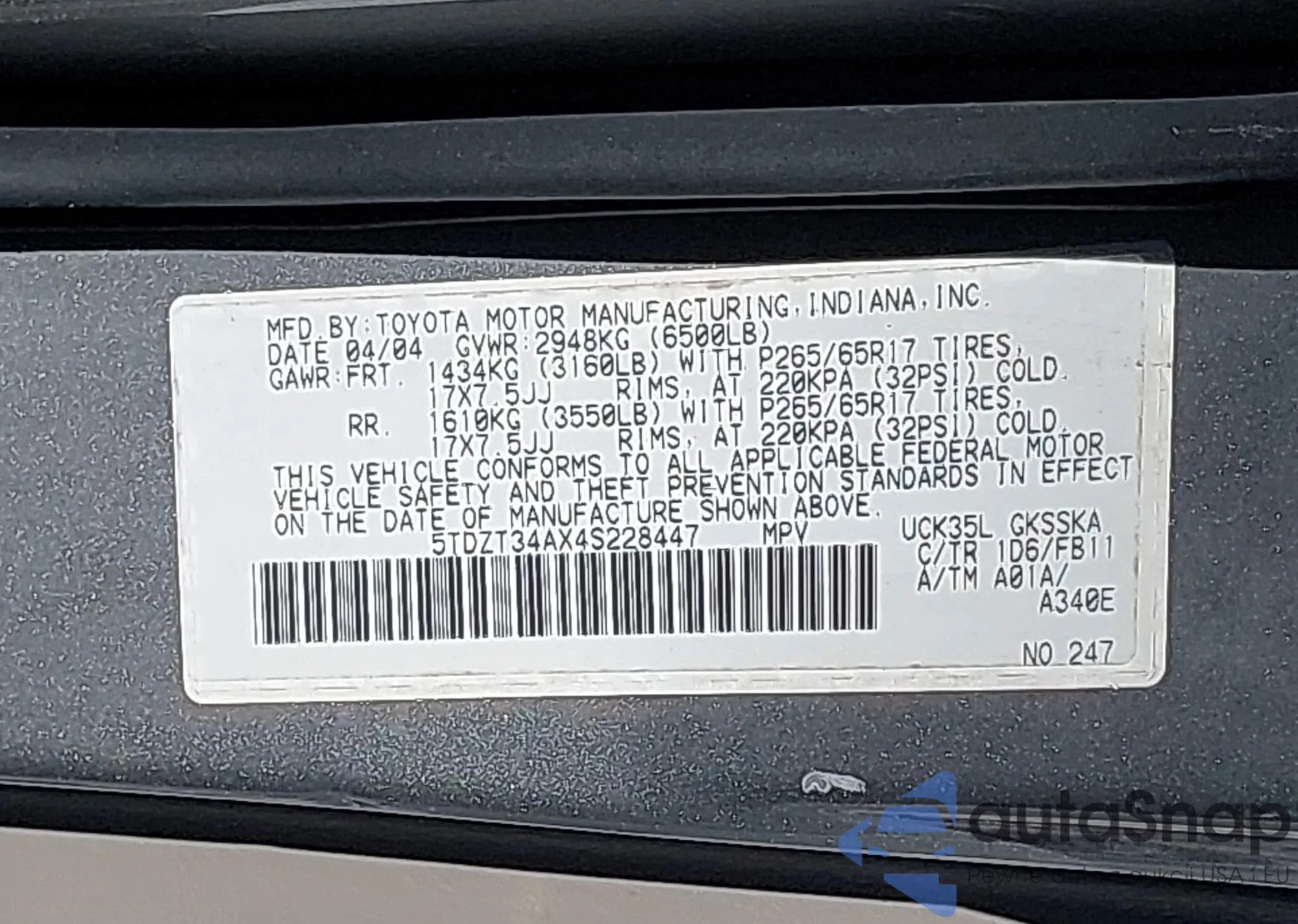 • VIN 5TDZT34AX4S228447